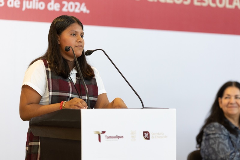 Durante la ceremonia se contó con la participación de la alumna Lizbeth Hernández del Ángel, quien cursó el sexto grado en la Escuela Primaria “Josefa Ortiz de Domínguez” de Reynosa, y de Brandon Damián Morín García, de sexto grado, de la Escuela Primaria «Emilio Carranza», de El Mante, en representación de los estudiantes de los ciclos escolares 2022-2023 y 2023-2024, respectivamente.