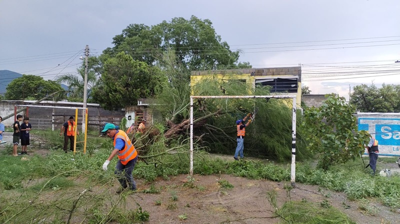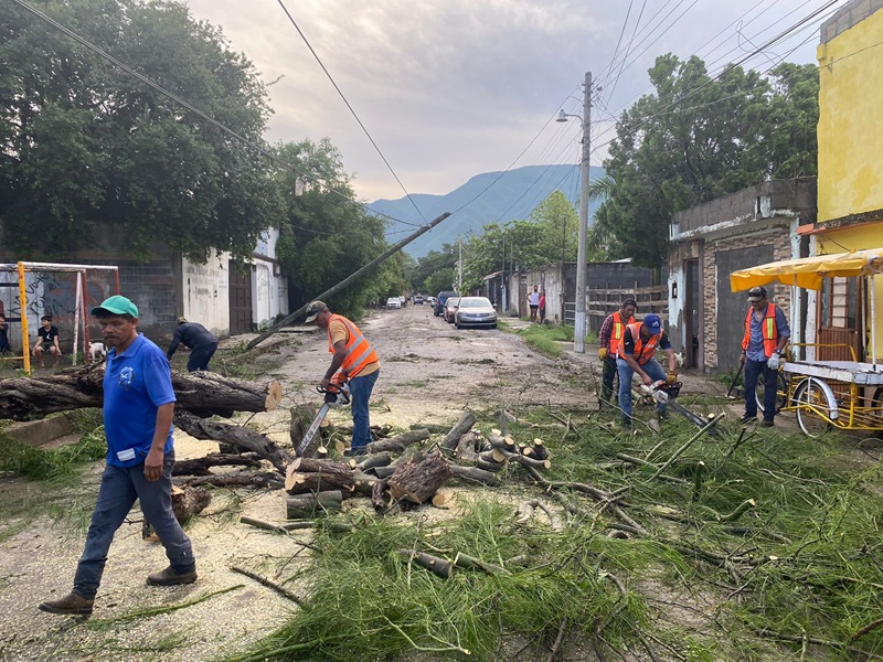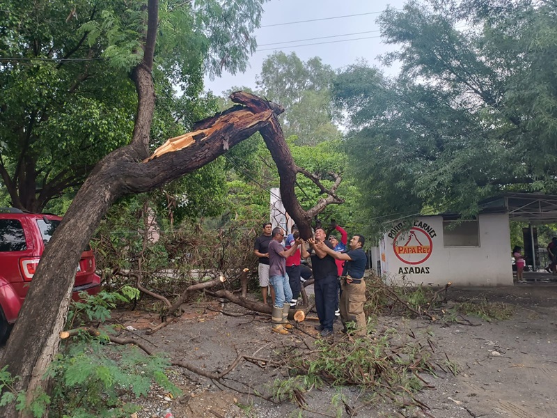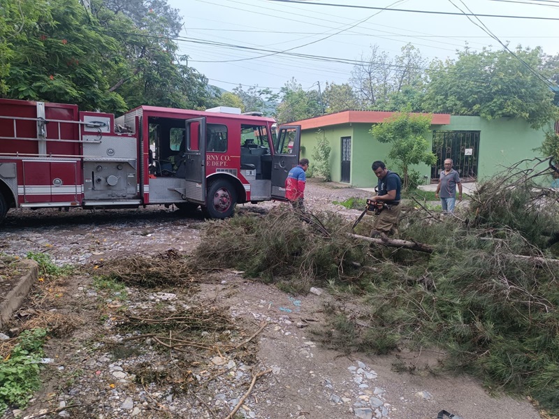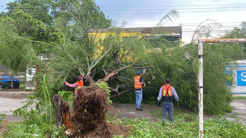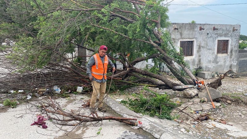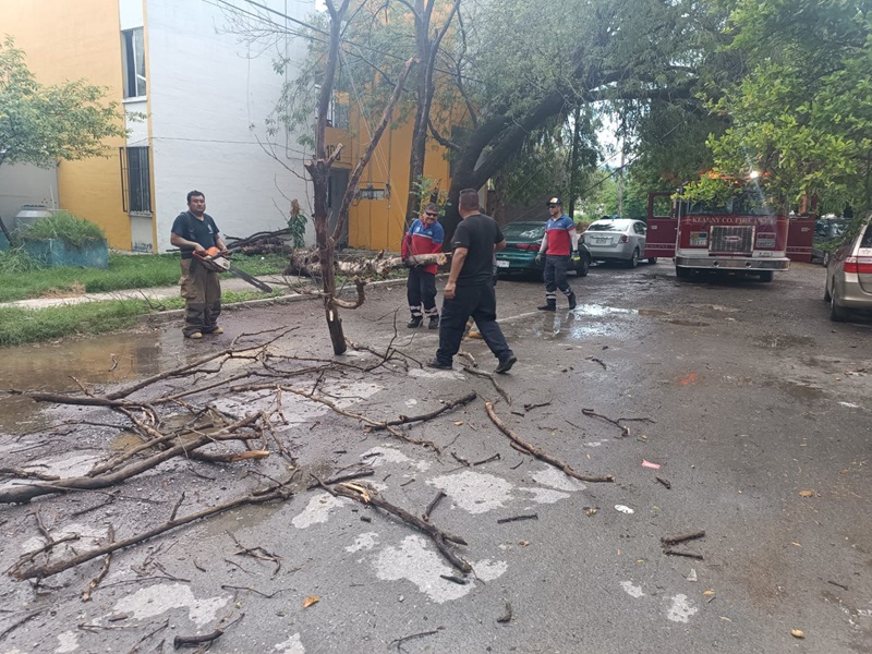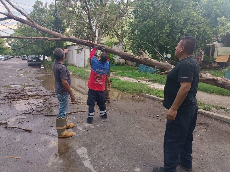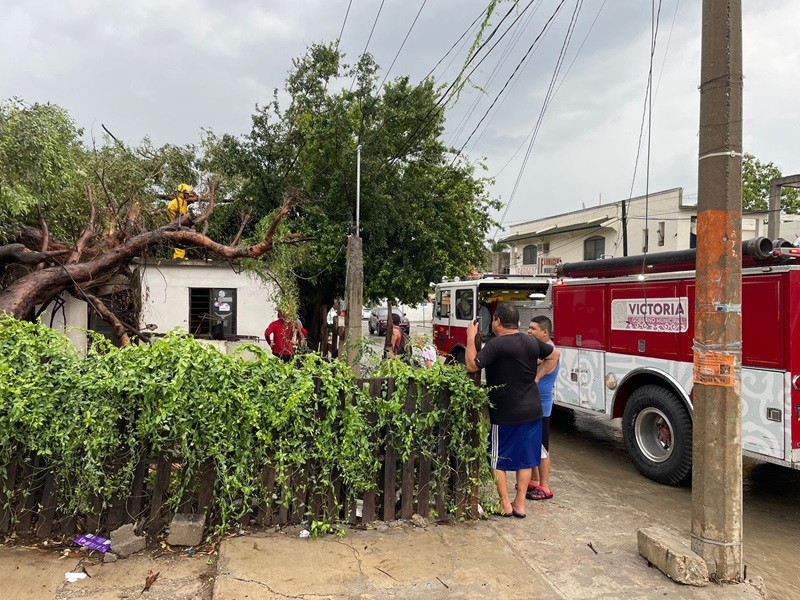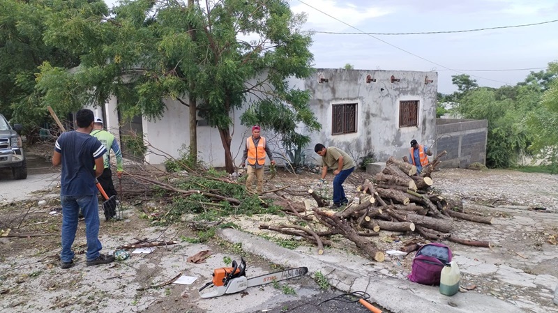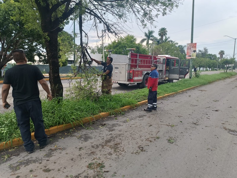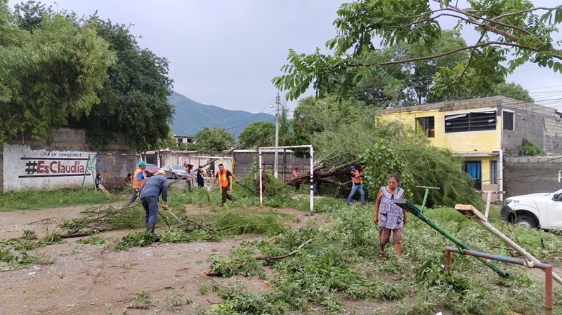 En equipo, cuadrillas de Parques y Jardines y Bomberos procedieron al retiro de ramas y troncos en casas, calles, áreas verdes y rejillas de drenaje pluvial de las colonias Américo Villarreal, Tamatán, Amalia G. de Castillo y Altas Cumbres.