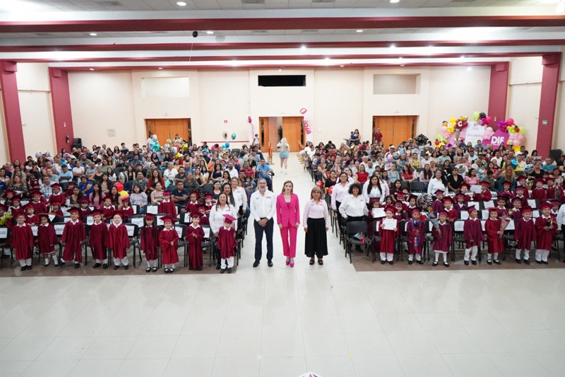 NUEVO LAREDO, TAMPS. Entre abrazos y la ilusión de culminar su primer etapa escolar, un total de 100 estudiantes de preescolar de los Centros de Asistencia Infantil Comunitaria (CAIC) del Sistema para el Desarrollo Integral de la Familia (DIF) de Nuevo Laredo, recibieron su diploma de fin de cursos en una emotiva ceremonia realizada en el Centro Cívico.