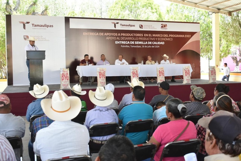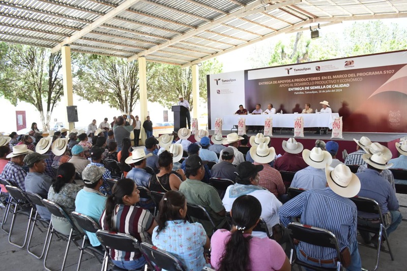 PALMILLAS, TAMPS. Con la firme intención de continuar apoyando a los productores del estado con programas y recursos que contribuyan al desarrollo sostenible del sector agropecuario, el Gobierno del Estado realizó la entrega de 2.72 toneladas de Semilla de Calidad de Maíz a productores rurales del municipio de Palmillas.