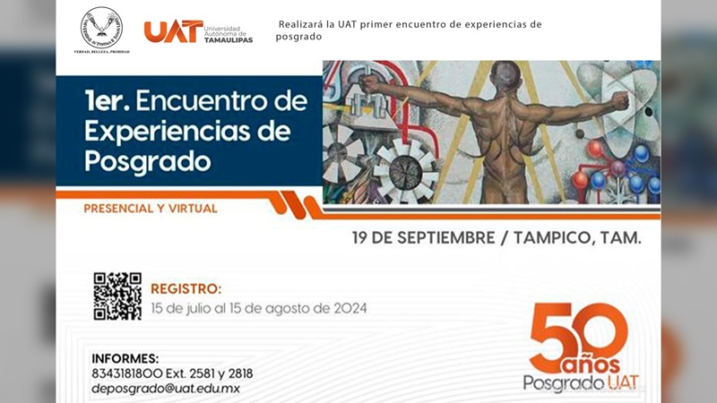 CIUDAD VICTORIA, TAMPS. La Universidad Autónoma de Tamaulipas, por medio de la Secretaría de Investigación y Posgrado, llevará a cabo el Primer Encuentro de Experiencias de Posgrado el 19 de septiembre en el campus universitario de Tampico, como parte de las celebraciones del 50 Aniversario del Posgrado en la UAT.