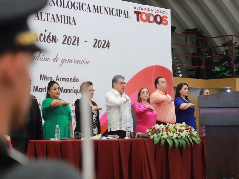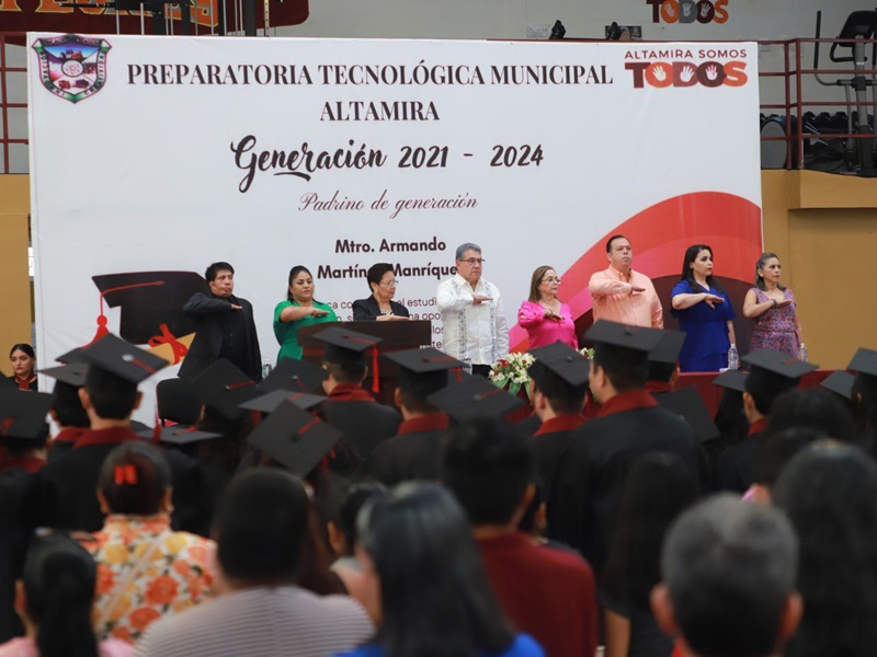 ALTAMIRA, TAMPS. En un evento marcado por la emoción y el orgullo, el presidente municipal de Altamira, Dr. Armando Martínez Manríquez, acompañado de su esposa, la C.P. Rossy Luque de Martínez, presidenta del Sistema DIF local, encabezó la ceremonia de fin de cursos de la Décimo Octava Generación de la Escuela Preparatoria Técnica Municipal de Altamira, acto llevado a cabo en el Auditorio Municipal “Reynaldo Castillo Portes”.