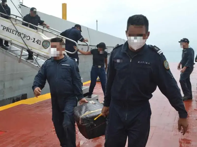 La Marina informo que aseguro 45 costalillas con aproximadamente 1,500 kilogramos de presunta cocaína frente a las costas de Guerrero. A aproximadamente 170 millas náuticas (135 kilómetros) al sur de Acapulco, Guerrero.