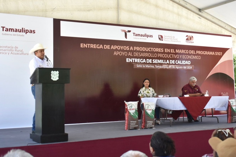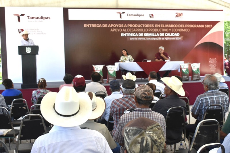 El evento se llevó a cabo en el ejido Tampiquito del municipio de Soto la Marina, donde se entregaron 2.280 toneladas de semilla de sorgo para sembrar una superficie de 342 hectáreas en beneficio de 58 productores de esta región.