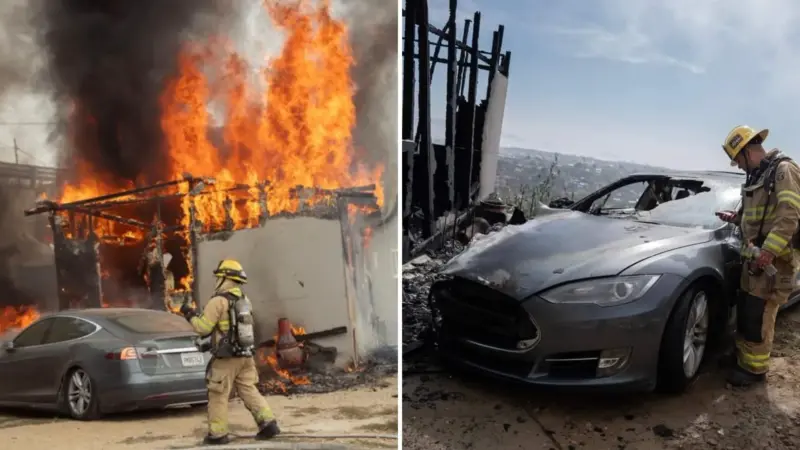 El famoso auto eléctrico fue envuelto en una llamarada con consecuencias funestas, alcanzando el fuego una vivienda que se encontraba a un lado.