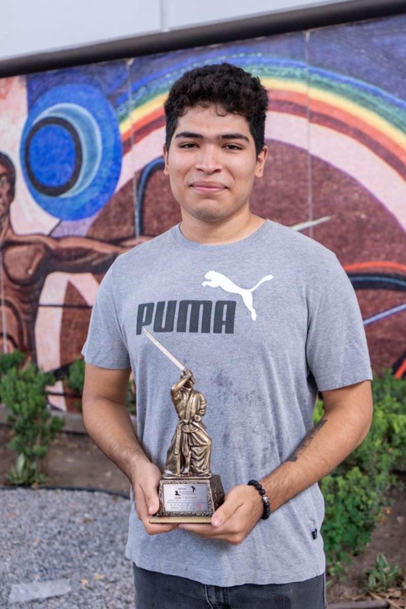 CIUDAD VICTORIA, TAMPS. José Félix Rodríguez Ávalos, alumno de la Universidad Autónoma de Tamaulipas (UAT), compartió con el rector de la UAT, MVZ. Dámaso Leonardo Alvarado, el trofeo del primer lugar obtenido en el 13º Campeonato Mundial de Haidong Gumdo, realizado en la isla de Jeju, Corea del Sur.
