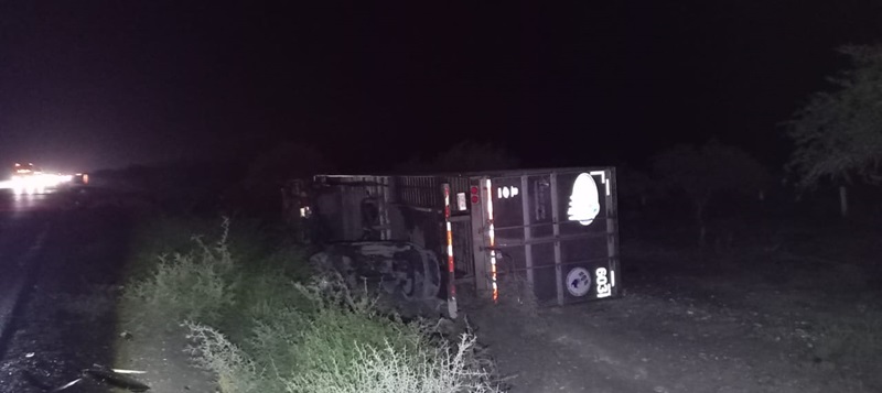 Al realizar recorridos de seguridad y vigilancia sobre el tramo Tula-San Luis Potosí, elementos de esta corporación visualizaron un tractocamión volcado fuera de la cinta asfáltica y uno más sobre el acotamiento.