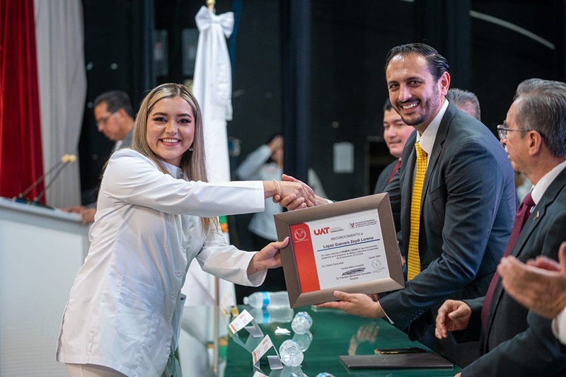 A nombre de los egresados, Lorena López Guevara agradeció la oportunidad que les brindó la UAT para su educación, además del apoyo recibido de docentes y autoridades universitarias, que les ha permitido prepararse en una carrera reconocida por su calidad académica y científica.