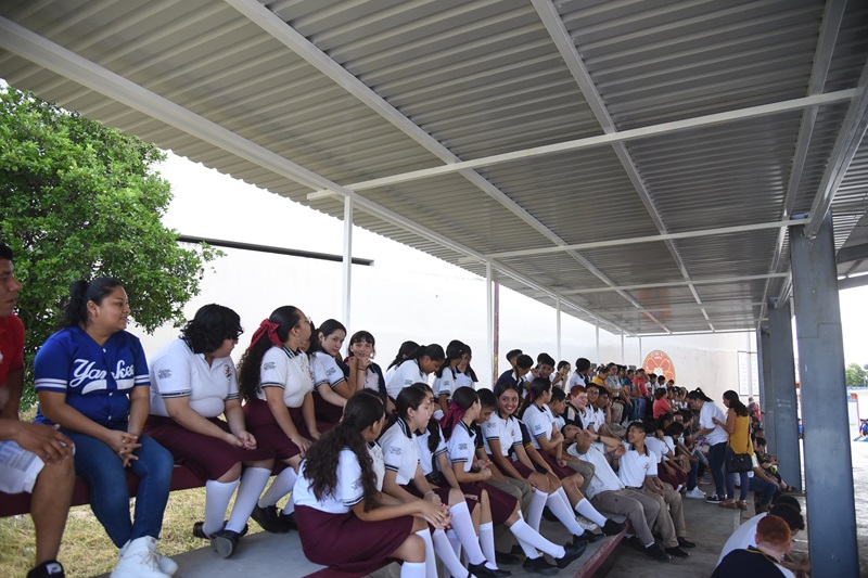 TAMPICO, TAMPS. Mediante una inversión cercana a los 300 mil pesos, el Presidente municipal Chucho Nader entregó este día la construcción de techumbre y gradas con protección solar, en la cancha de usos múltiples de la escuela secundaria General número 7, «Francisco Medina Cedillo» de la colonia Unidad Modelo.