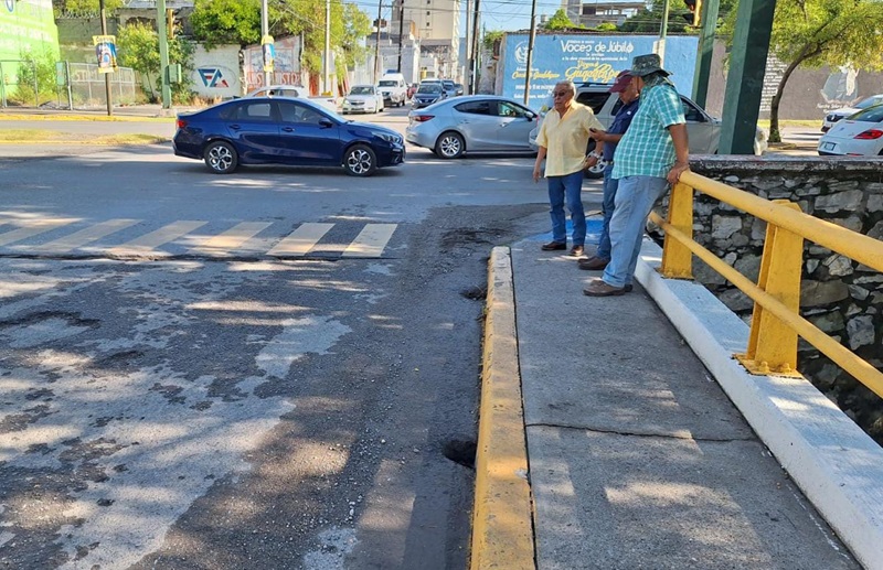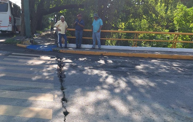 Eusebio Alfaro Reyna, titular de la dependencia, encabezó la supervisión junto a elementos de la Coordinación de Protección Civil para determinar el daño que presenta la construcción de concreto por el continuo tráfico vehicular y exceso de humedad derivada de las recientes lluvias.