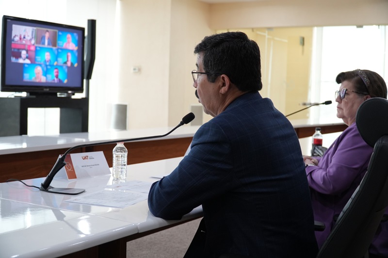 En la sesión, el rector estuvo acompañado por la secretaria académica, Dra. Rosa Issel Acosta González. De manera remota participaron el Mtro. René Adrián Salinas Salinas, director de la Facultad de Comercio, Administración y Ciencias Sociales Nuevo Laredo; y por parte de los CIEES, el Dr. José Alberto Gaytán García, vocal ejecutivo del Comité de Ciencias Sociales y Administrativas; la Dra. María Estela Morales Tamez, coordinadora de la Comisión de Pares Académicos Externos; así como el Dr. Roberto Aude Díaz y el Dr. José Enrique Rivera Rodríguez, miembros de la Comisión de Pares Académicos Externos.