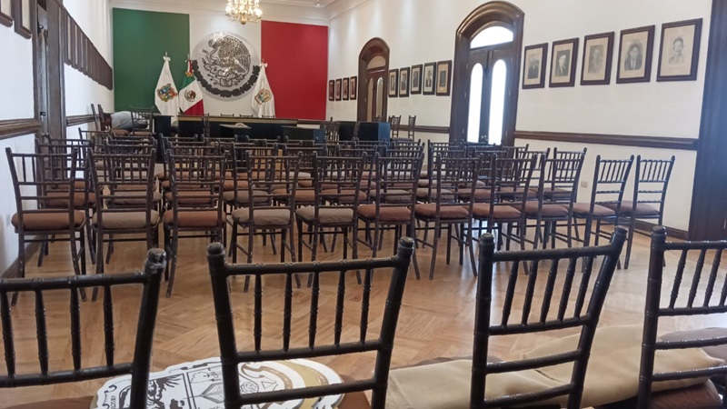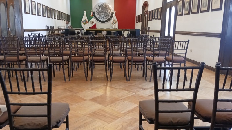 La Sala de Cabildo, designada como recinto oficial para la ceremonia protocolaria, quedó acondicionada este lunes para recibir a las 6:00 pm, de este martes 3 de septiembre, a la comitiva de invitados que incluye la familia del Alcalde Capitalino, integrantes de Gabinete, empresarios y líderes sociales.