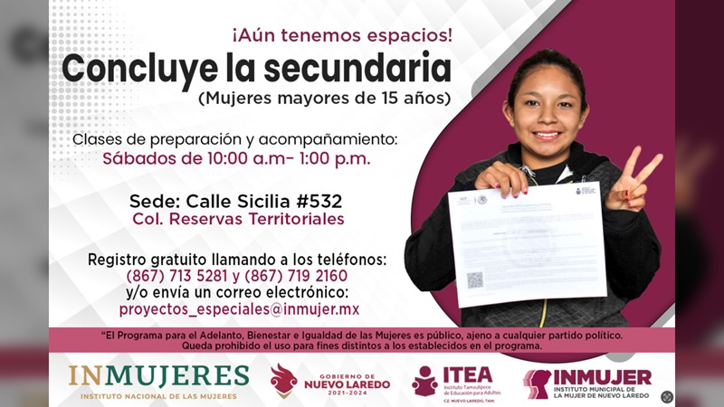 NUEVO LAREDO, TAMPS. El Gobierno Municipal, a través del Instituto Municipal de la Mujer (INMUJER) y en colaboración con el Instituto Tamaulipeco de Educación para Adultos (ITEA), invita a las mujeres mayores de 15 años a terminar la educación secundaria mediante un apoyo que brindan ambos organismos.