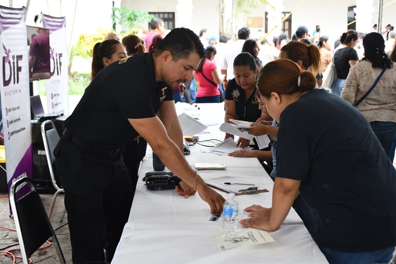 CIUDAD VICTORIA, TAMPS. Teniendo como principio la equidad de género, personal del área de reclutamiento de la Secretaría de Seguridad Pública de Tamaulipas (SSPT) participó en la Feria “Empleo para Todas” celebrada en la Presidencia Municipal de Ciudad Victoria.