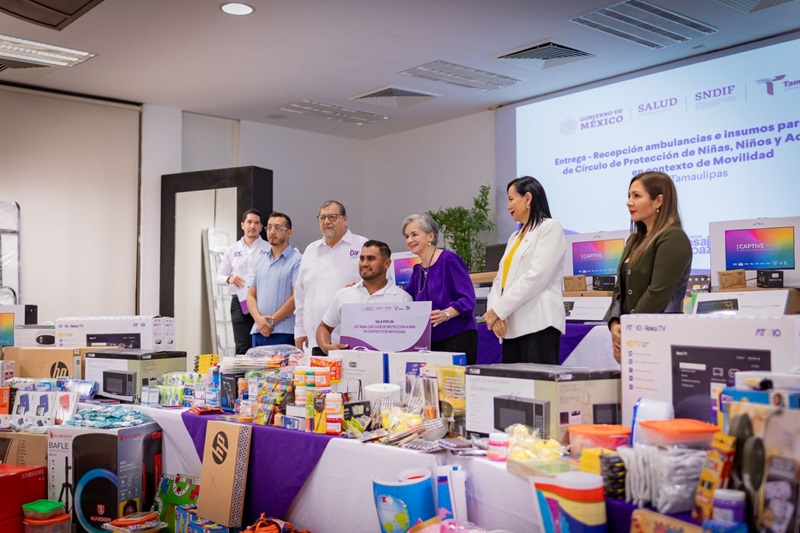 CIUDAD VICTORIA, TAMPS. En las instalaciones del DIF estatal, la presidenta del Sistema DIF Tamaulipas, María de Villarreal, llevó a cabo la entrega de ambulancias y paquetes de insumos para la habilitación de los “Círculos de Protección para Niñas, Niños y Adolescentes en Contexto de Movilidad en Tamaulipas”, ubicados en Nuevo Laredo, Reynosa y Matamoros, municipios estratégicos por su ubicación geográfica y flujo migratorio.