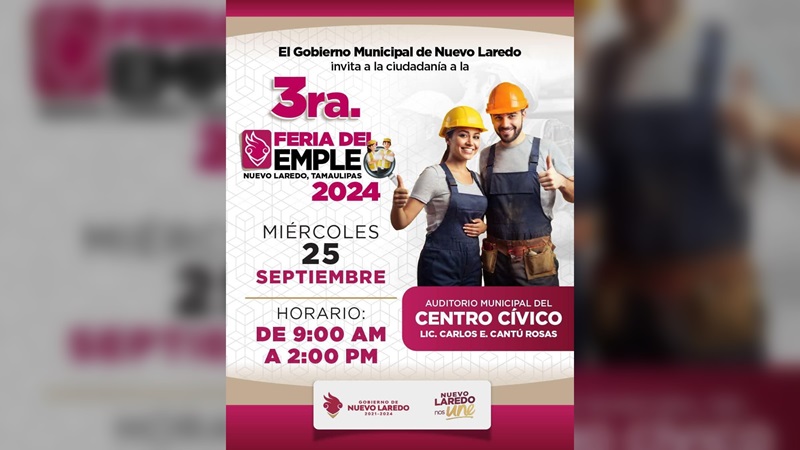 NUEVO LAREDO, TAMPS. El Gobierno Municipal invita a la ciudadanía a la Tercera Feria del Empleo que se realizará en el Centro Cívico “Carlos E. Cantú Rosas” este miércoles 25 de septiembre en horario de las 9:00 AM a las 2:00 PM.