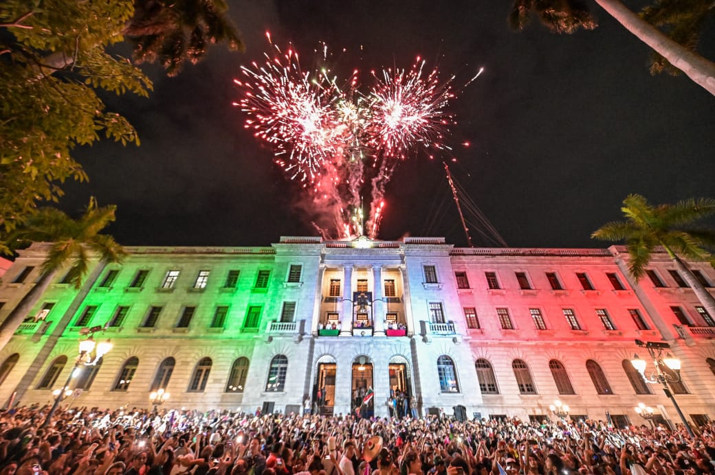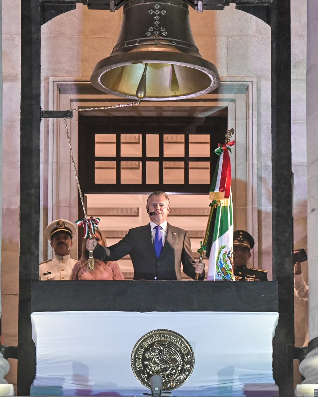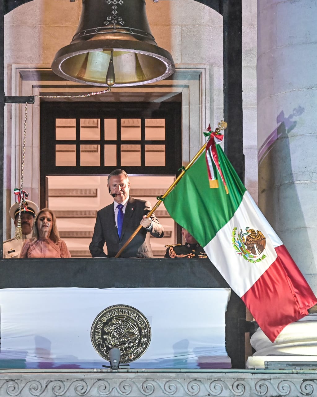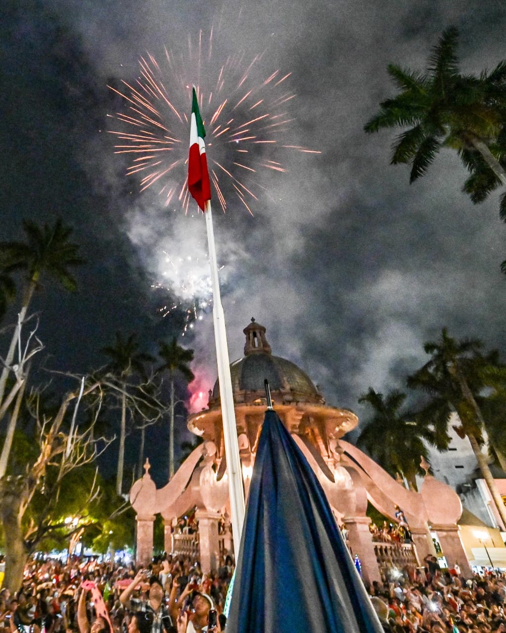 Tras ondear la bandera y repicar la campana, el edil entregó la enseña nacional a la escolta del Ejército Mexicano, mientras la multitud disfrutó un extraordinario espectáculo de fuegos artificiales.