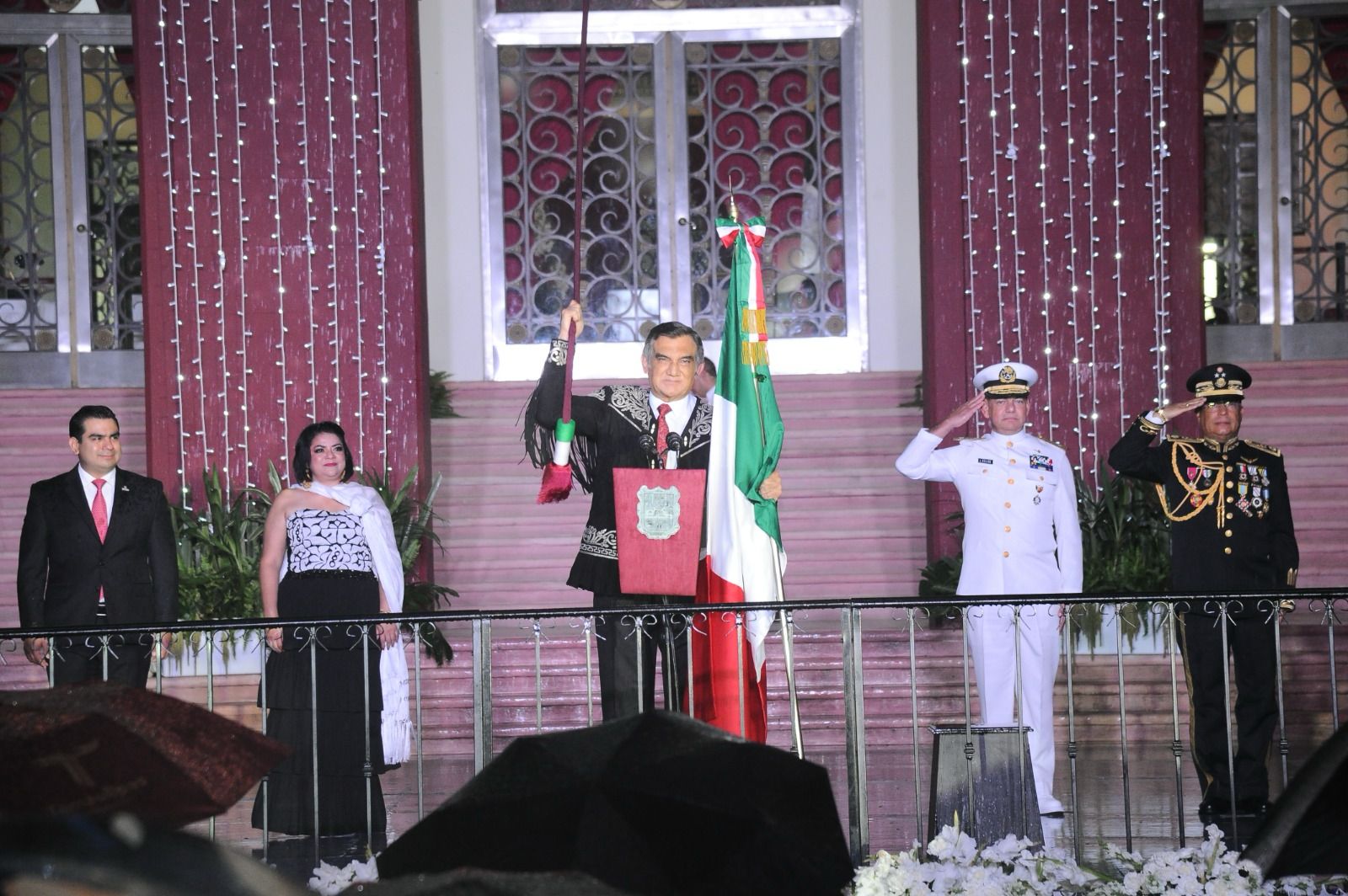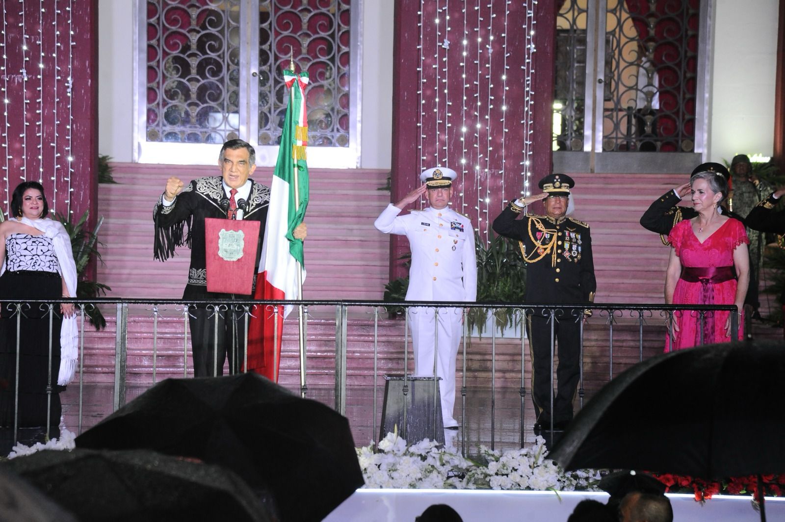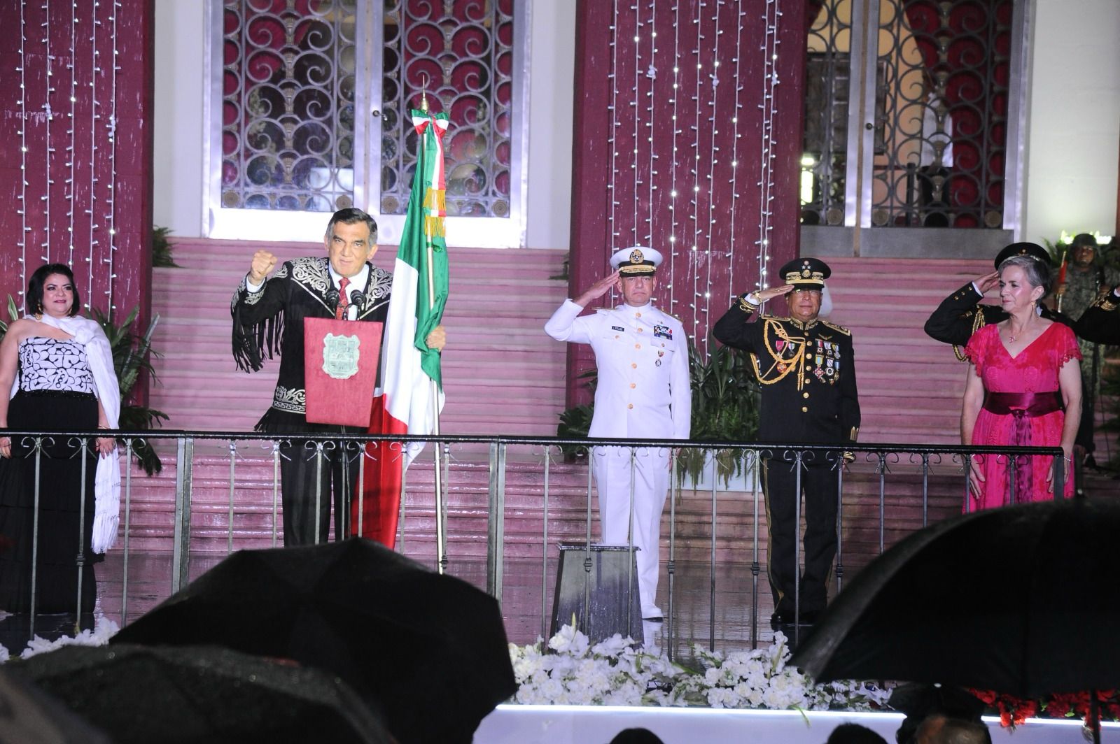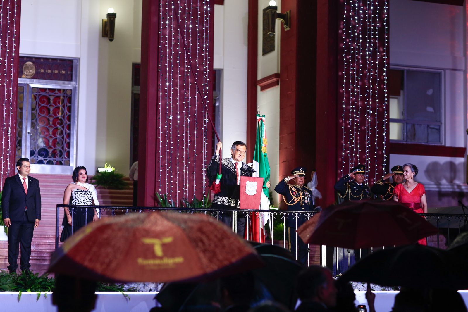 En una noche de fiesta, ante una abarrotada Plaza Juárez, el gobernador Américo Villarreal, acompañado por su esposa, la presidenta del DIF Estatal, doctora María de Villarreal, y los titulares de los Poderes Legislativo y Judicial, salió al pórtico principal de Palacio de Gobierno. Tras recibir la Bandera Nacional de manos de la Escolta del 77 Batallón de Infantería, evocó el llamado del Padre de la Patria, Miguel Hidalgo, al pueblo de Dolores aquella madrugada del 16 de septiembre de 1810.