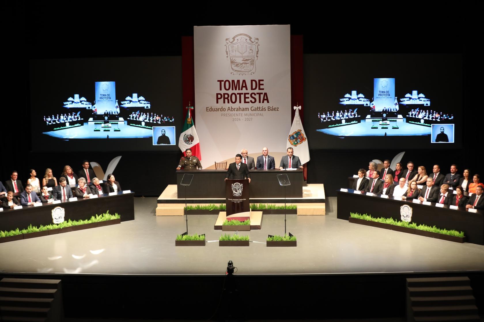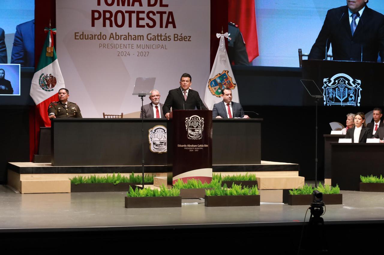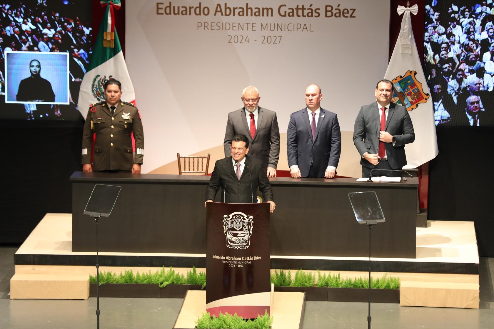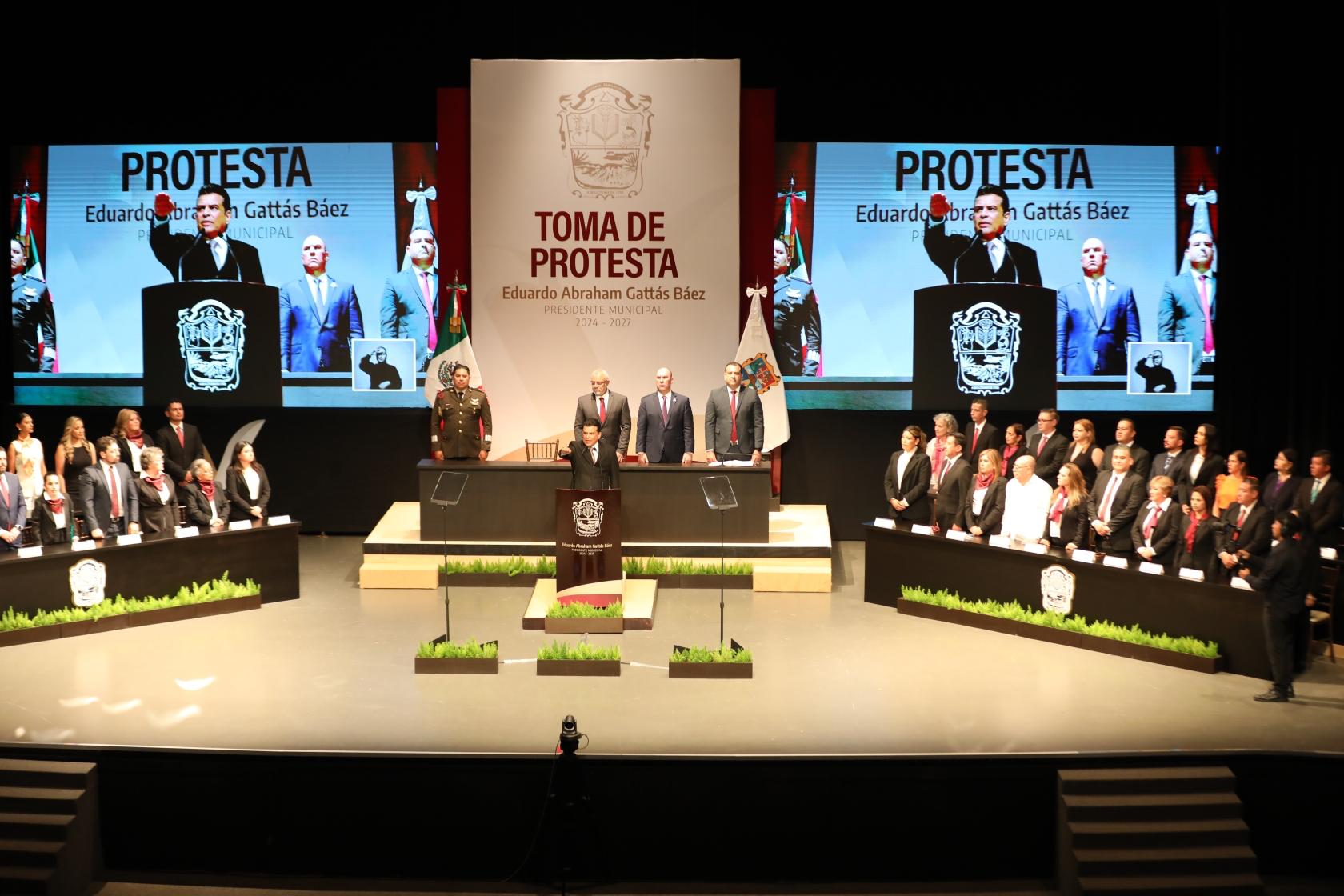 CIUDAD VICTORIA, TAMPS. En sesión solemne de Cabildo, Eduardo Abraham Gattás Báez tomó protesta constitucional como presidente municipal de Victoria para el segundo período 2024-2027, donde refrendó su compromiso y voluntad de seguir trabajando unidos sociedad y gobierno en la transformación del segundo piso de la Capital del Estado.