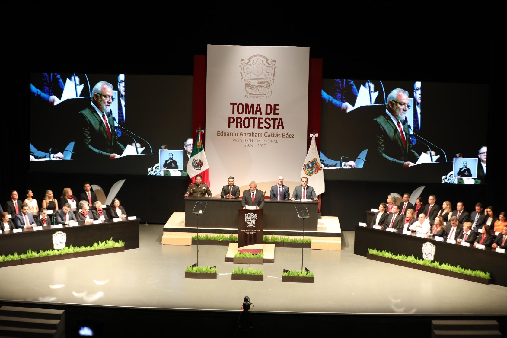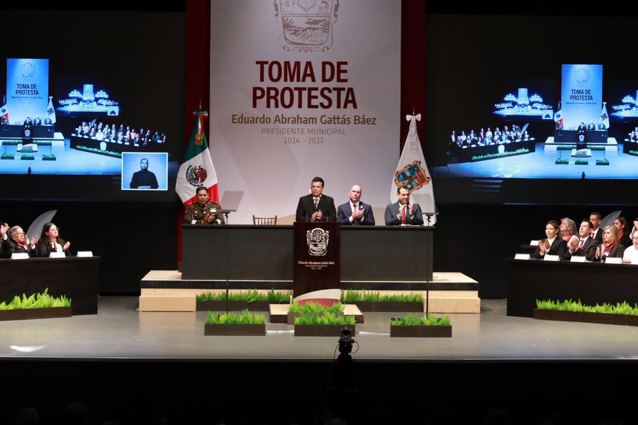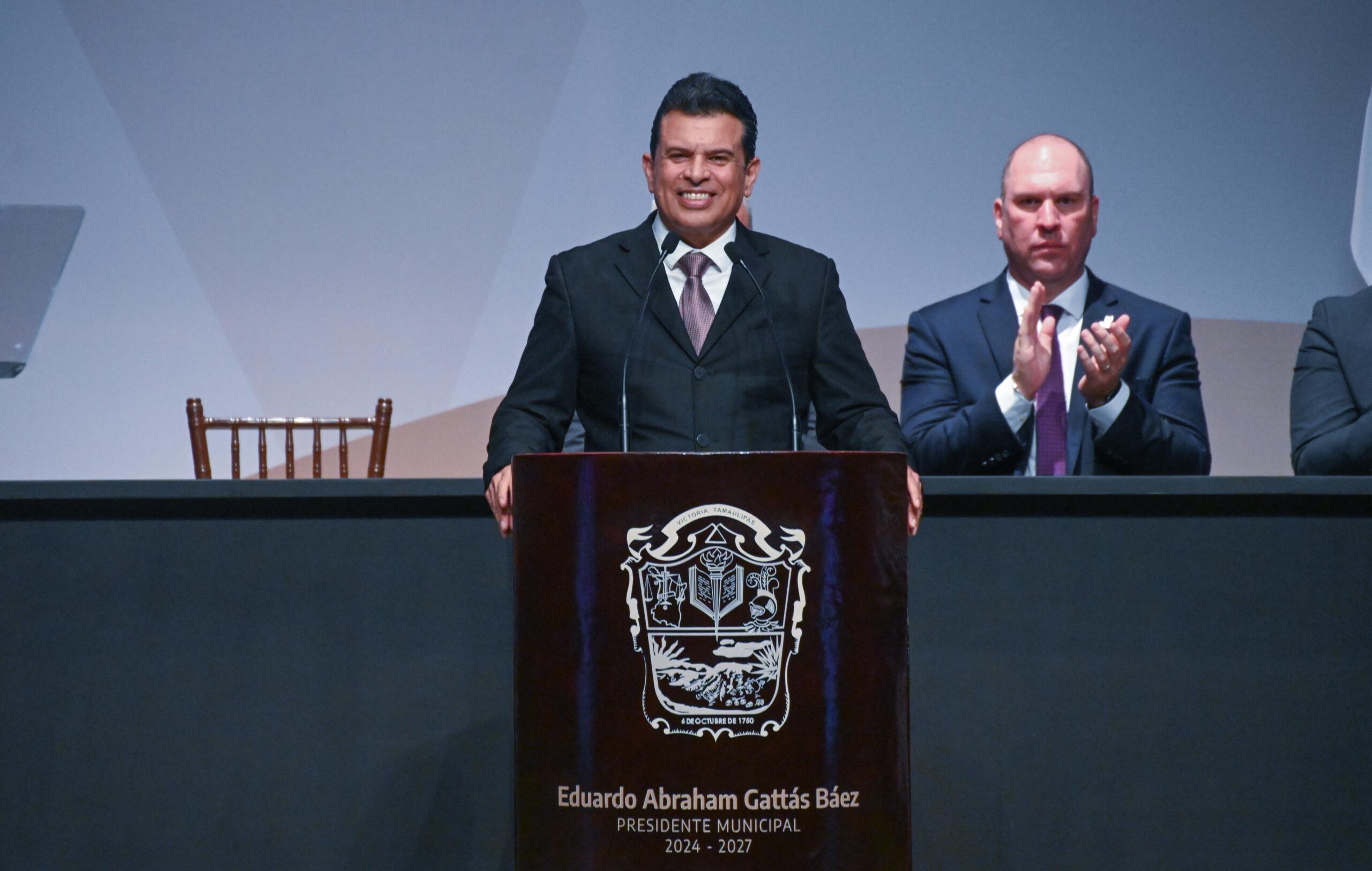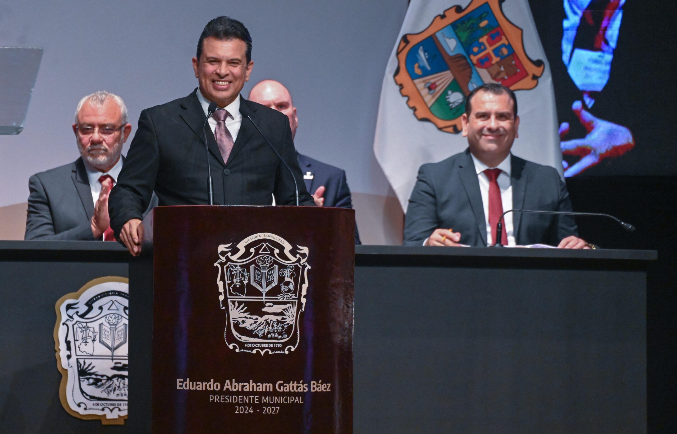 CIUDAD VICTORIA, TAMPS. En sesión solemne de Cabildo, Eduardo Abraham Gattás Báez tomó protesta constitucional como presidente municipal de Victoria para el segundo período 2024-2027, donde refrendó su compromiso y voluntad de seguir trabajando unidos sociedad y gobierno en la transformación del segundo piso de la Capital del Estado.