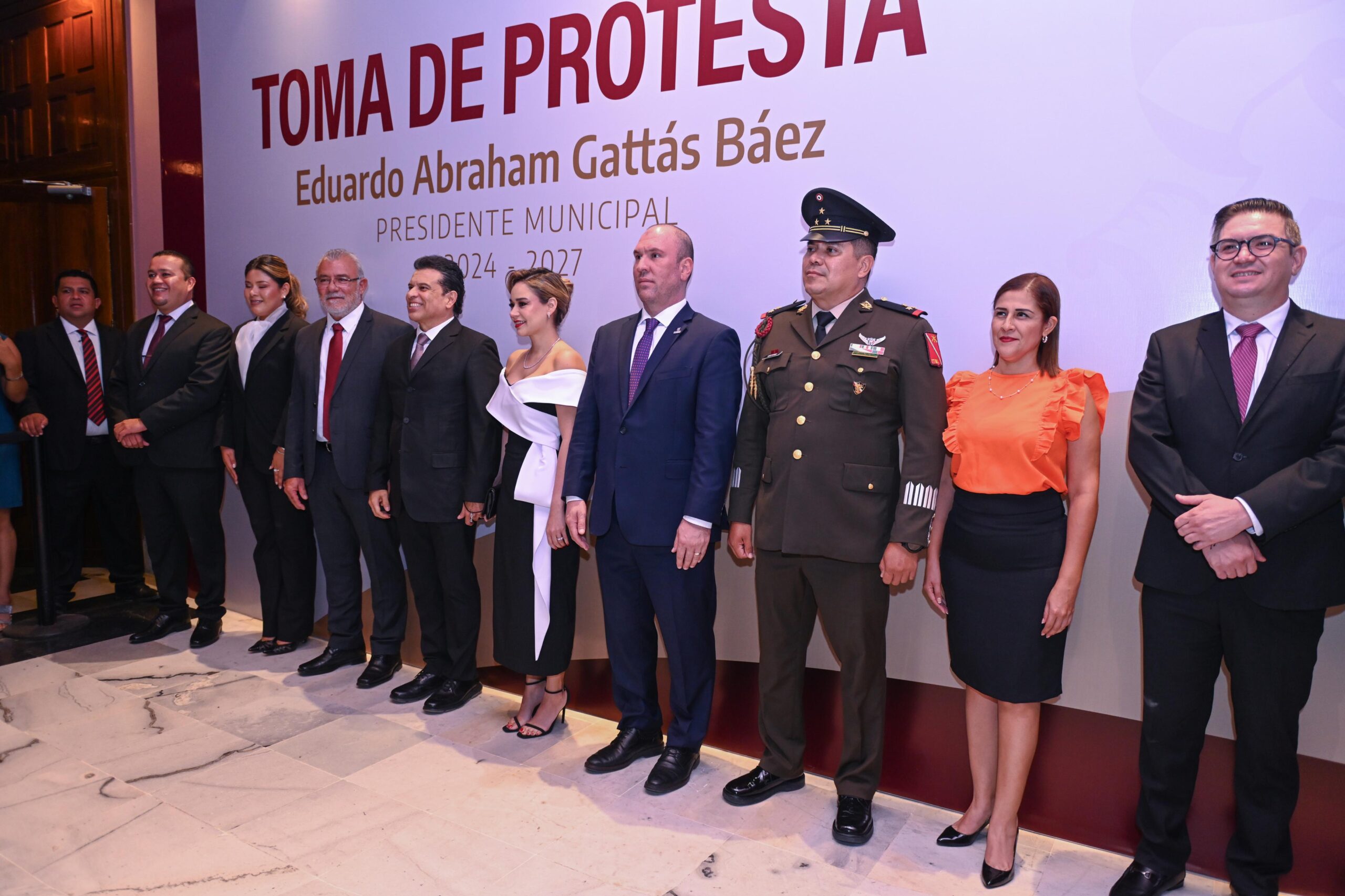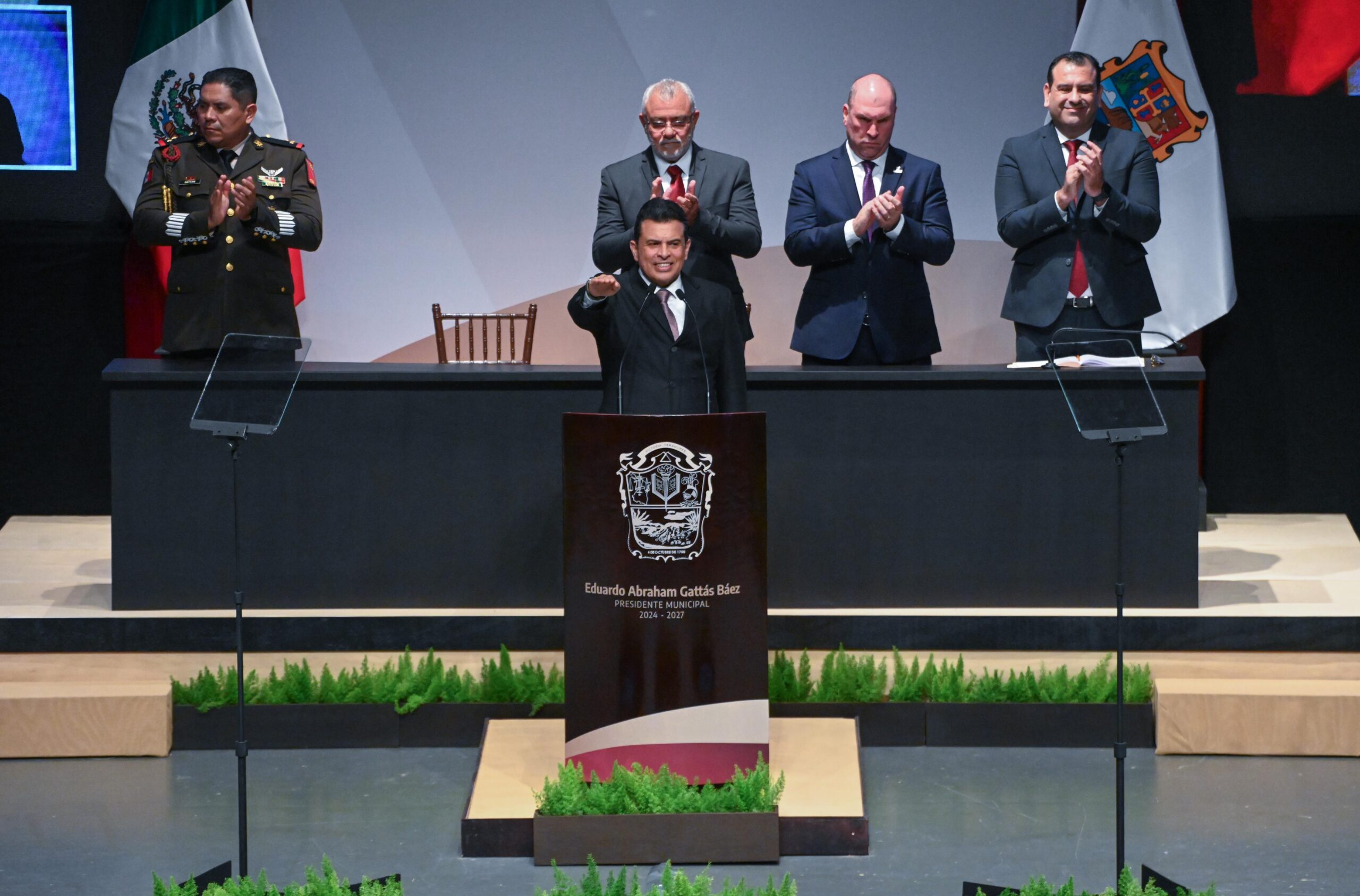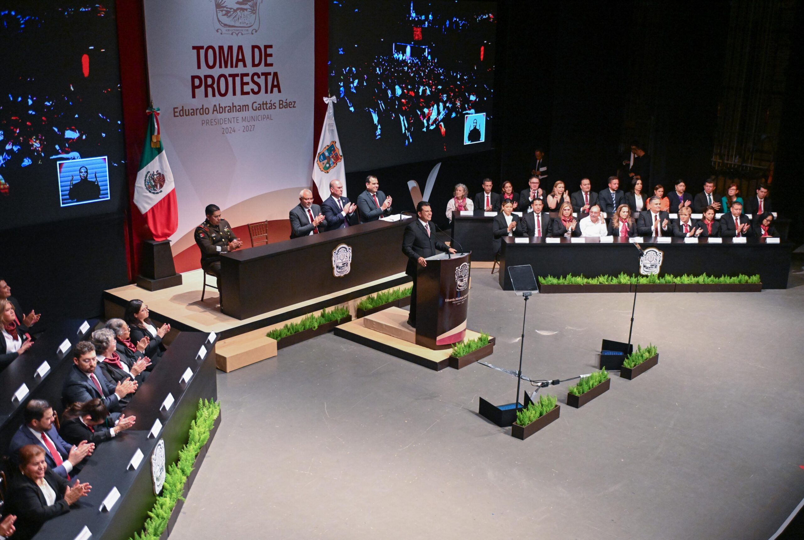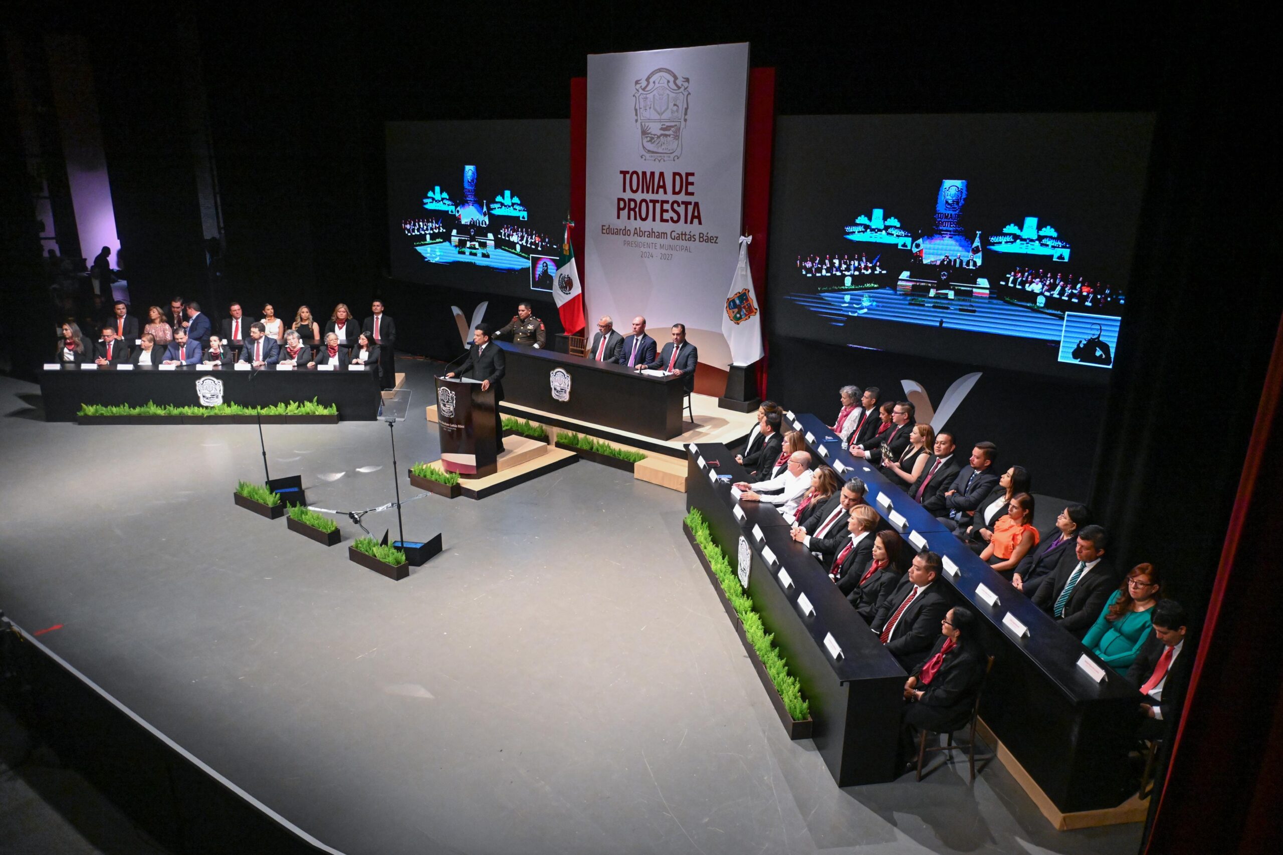 CIUDAD VICTORIA, TAMPS. En sesión solemne de Cabildo, Eduardo Abraham Gattás Báez tomó protesta constitucional como presidente municipal de Victoria para el segundo período 2024-2027, donde refrendó su compromiso y voluntad de seguir trabajando unidos sociedad y gobierno en la transformación del segundo piso de la Capital del Estado.