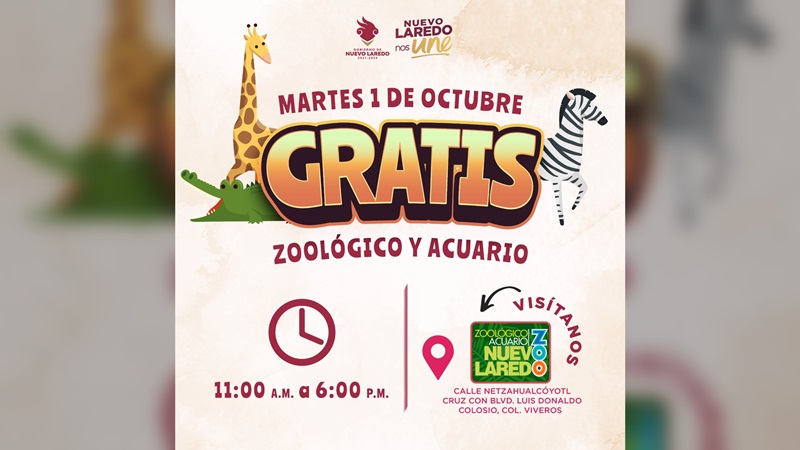 NUEVO LAREDO, TAMPS. Este martes 1 de octubre el Zoológico y Acuario de la ciudad permanecerán abiertos, además que este día la entrada es gratuita por lo que invitan a la población a acudir a divertirse.