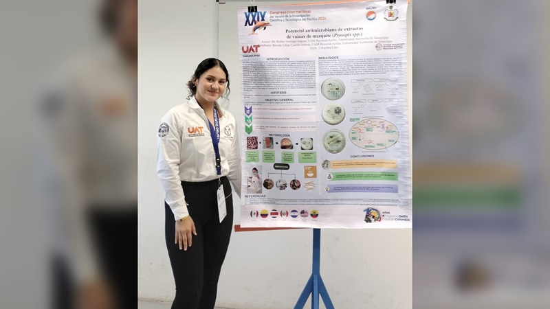 El proyecto, titulado “Potencial antimicrobiano de extractos de vaina de mezquite (Prosopis spp.)”, fue presentado por la estudiante universitaria en el Congreso Internacional del Verano de la Investigación Científica y Tecnológica del Pacífico 2024, celebrado en Nuevo Vallarta, Nayarit.