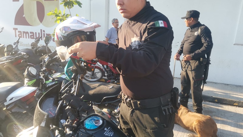 Aún después de que los estudiantes entraron a clases, al continuar con la revisión, el binomio canino detectó una bolita con una sustancia aparentemente ‘droga’ escondida en una motocicleta estacionada afuera del plantel escolar de nivel bachillerato.
