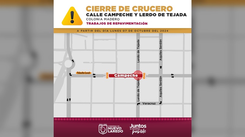 NUEVO LAREDO, TAMPS. El crucero formado por las calles Campeche y Lerdo de Tejada, en la colonia Madero, será cerrado a la circulación a partir del 7 de octubre ya que se estarán llevando a cabo obras de repavimentación.