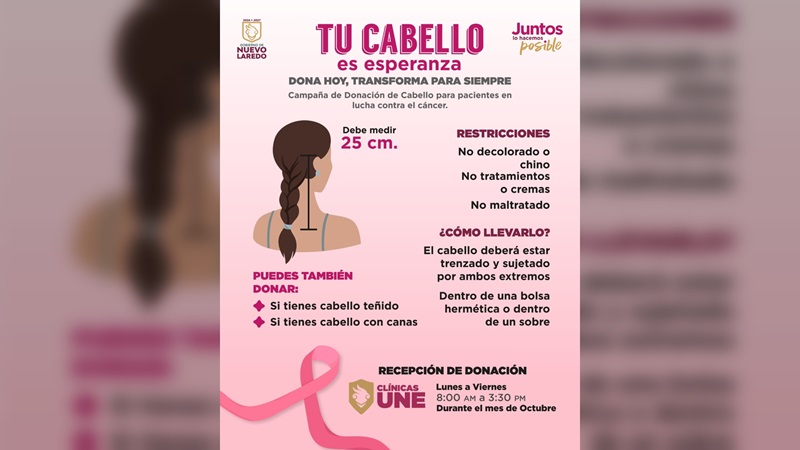 NUEVO LAREDO, TAMPS. El Gobierno Municipal invita a la ciudadanía a sumarse a una causa especial, donando cabello para elaborar pelucas que serán utilizadas por niños, adolescentes y adultos, víctimas de cáncer.