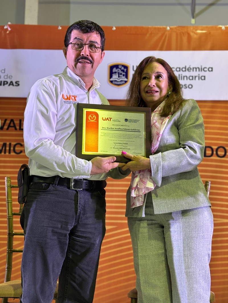 Acompañado por el director de la UAM Valle Hermoso, Fernando Villanueva Pineda, el rector le entregó un reconocimiento a la Dra. Martha Josefina Gómez Gutiérrez, egresada de la primera generación y que actualmente se desempeña como profesora-investigadora en la Universidad Nacional Autónoma de México.