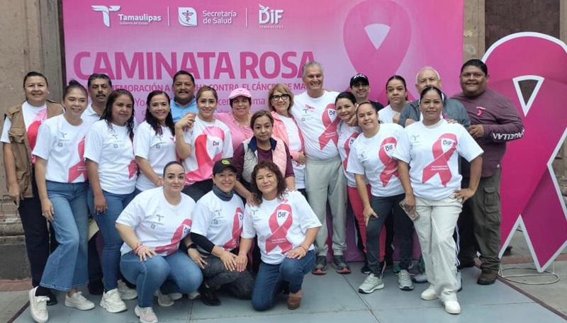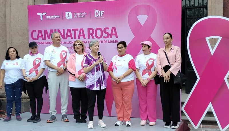 CIUDAD VICTORIA, TAMPS. Para conmemorar el ‘Día Internacional de la Lucha contra el Cáncer de Mama’, la doctora María Santiago de Villarreal, presidenta del Sistema DIF Tamaulipas, en compañía por el secretario de Salud, Vicente Joel Hernández Navarro, dio el banderazo de salida de la “Caminata Rosa” con la cual se busca concientizar a mujeres y hombres sobre lo importante que es la prevención y la detección oportuna de este padecimiento.