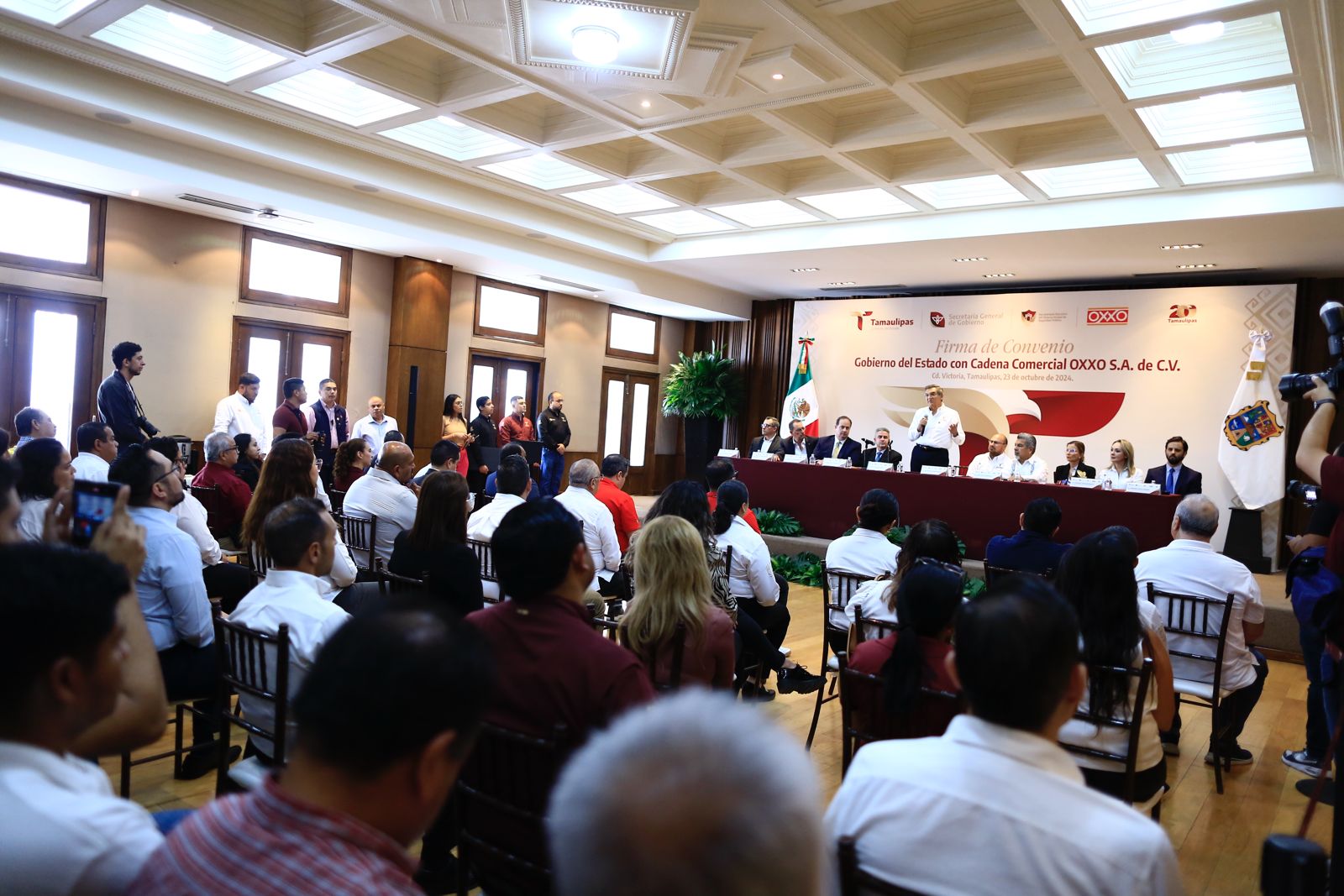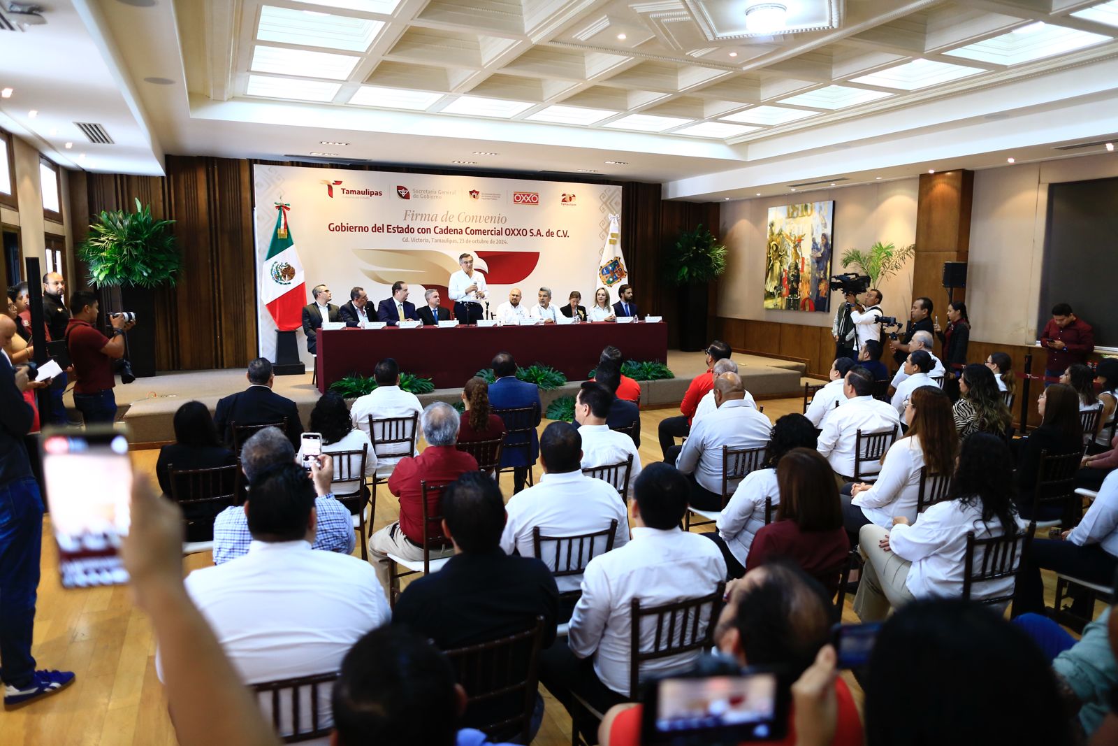 Durante el evento celebrado en el Salón Independencia de Palacio de Gobierno y acompañado por Jorge Arturo Sánchez López, apoderado legal de la Cadena Comercial Oxxo, y por un grupo de directivos de alto nivel del consorcio empresarial, el gobernador del estado dio la bienvenida a esta iniciativa y confió en que sirva de ejemplo e impulso para seguir sumando y contar con una mayor confianza de los inversionistas en las grandes oportunidades que tiene Tamaulipas.