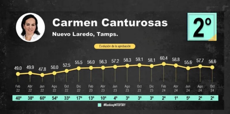 La neolaredense solamente fue superada por cuatro décimas por Antonio Astiazarán; el presidente municipal de Hermosillo, Sonora, se colocó al frente del ranking, aunque llega a la posición número uno con apenas 57.0% por ciento.