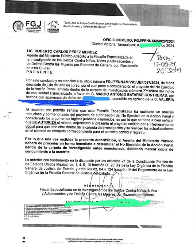 La titular de la FENNAM, Mireya Maldonado Villegas, emitió un oficio en respuesta a la solicitud del Agente del Ministerio Público Roberto Carlos Pérez Méndez para la no acción penal tras un análisis minucioso, determinando autorizar dicha solicitud.