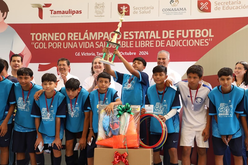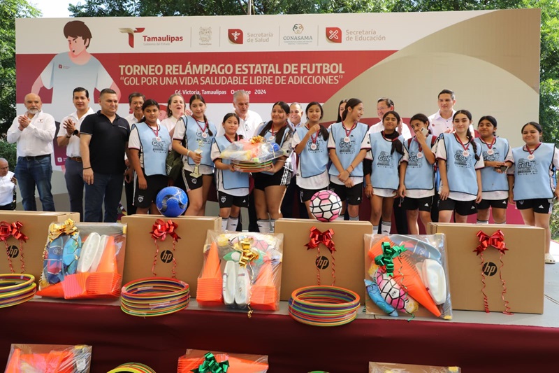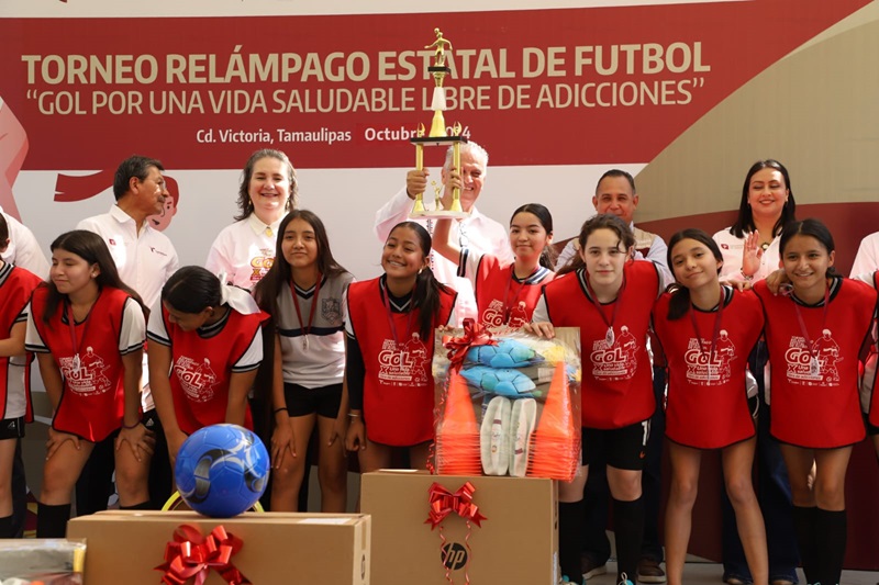 CIUDAD VICTORIA, TAMPS. Con la participación de alumnas y alumnos de diversas escuelas del nivel de educación secundaria, se realizó el Torneo Relámpago Estatal de Fútbol “Gol por una Vida Saludable Libre de Adicciones”.