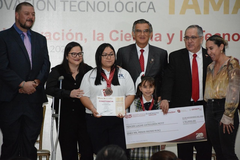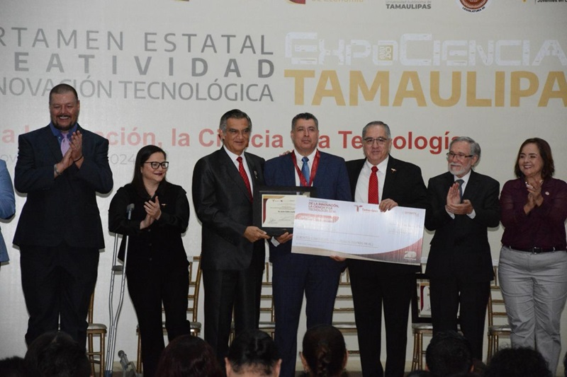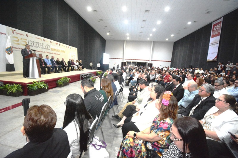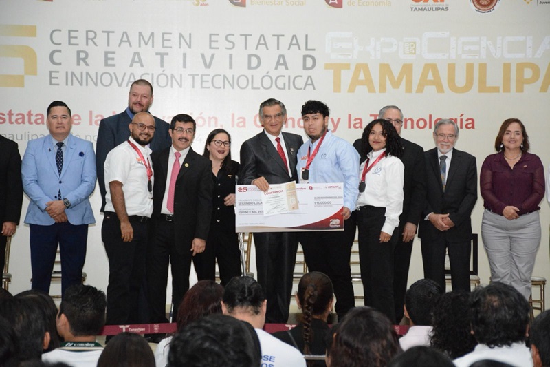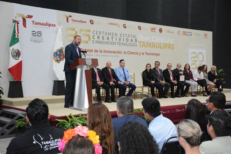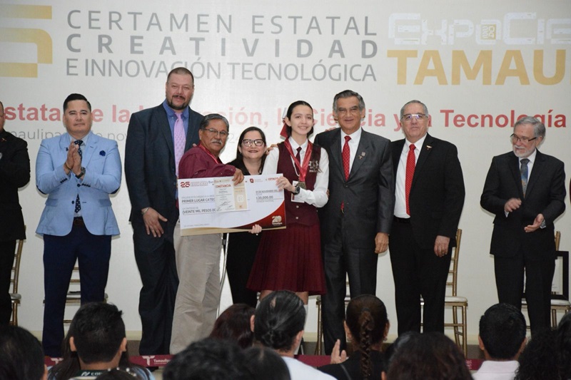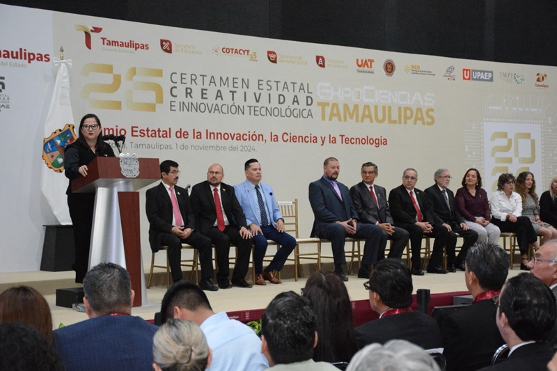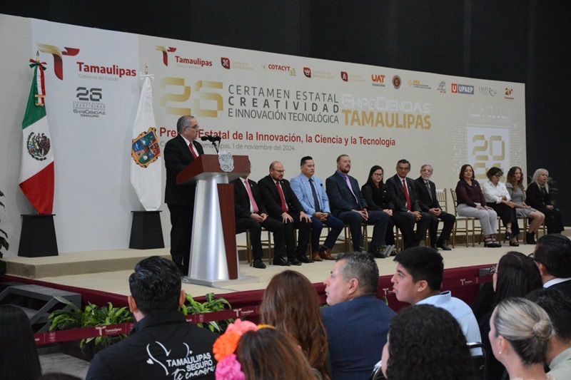 Al presidir la ceremonia de premiación del 26 Certamen Estatal de Creatividad e Innovación Tecnológica-ExpoCiencias Tamaulipas y la entrega del Premio Estatal de la Innovación, la Ciencia y la Tecnología en el Polyforum de esta capital, el gobernador del Estado, junto con la secretaria de Educación, Lucía Aimé Castillo Pastor y el director general del Consejo Tamaulipeco de Ciencia y Tecnología, Julio Martínez Burnes, felicitó a las y los ganadores y aseguró que con su talento, conocimiento, investigación y desarrollo, con una visión colaborativa y participativa, podrán brindar soluciones para este futuro de oportunidad y de riesgo del que tenemos que salir adelante.