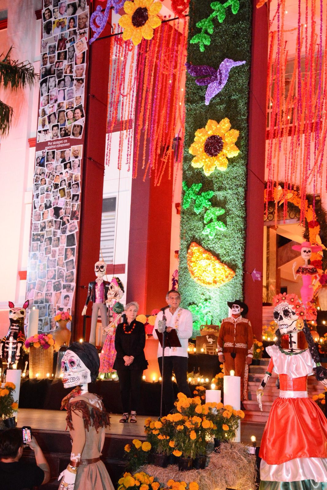 El altar instalado en el pórtico principal de Palacio de Gobierno fue elaborado nuevamente por artesanos tamaulipecos y cuenta con símbolos distintivos como la mariposa monarca, el colibrí, las naranjas y piñatas artesanales, además de estar adornado con flores de cempasúchil y gigantescas figuras alusivas a esta festividad.