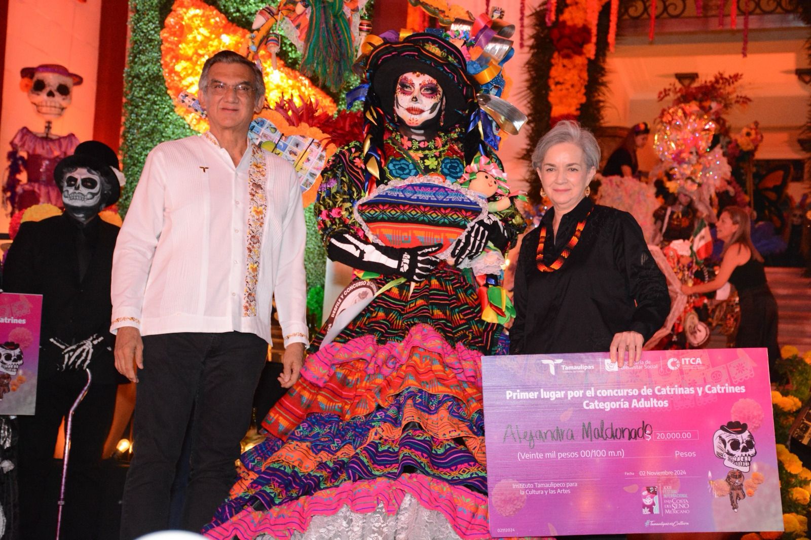 CIUDAD VICTORIA, TAMPS. El gobernador Américo Villarreal Anaya y la presidenta del DIF Estatal, María de Villarreal, premiaron a las y los ganadores del concurso de “Catrinas y Catrines Tradición y Color” y recorrieron junto con las familias victorenses el altar monumental instalado en Palacio de Gobierno como parte de las festividades del Día de Muertos.