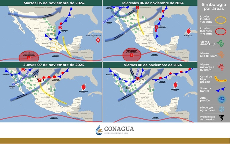 Para el martes 5 de noviembre, el frente frío No. 7 continuará su recorrido hacia el noreste y oriente del país, generando lluvias intensas en Puebla y Veracruz, así como descensos de temperatura en el norte y noreste de México. Ráfagas de viento de hasta 70 km/h afectarán el litoral de Tamaulipas y Veracruz.