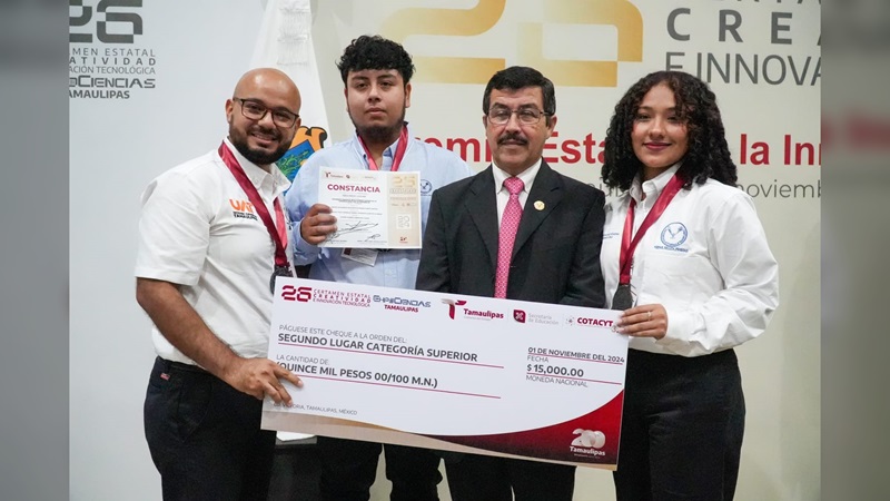 En el marco del evento celebrado en esta capital, los jóvenes y su asesor recibieron el premio de manos del gobernador Américo Villarreal Anaya, acompañados por el rector de la UAT, Dámaso Anaya Alvarado, quien los felicitó por este importante logro.