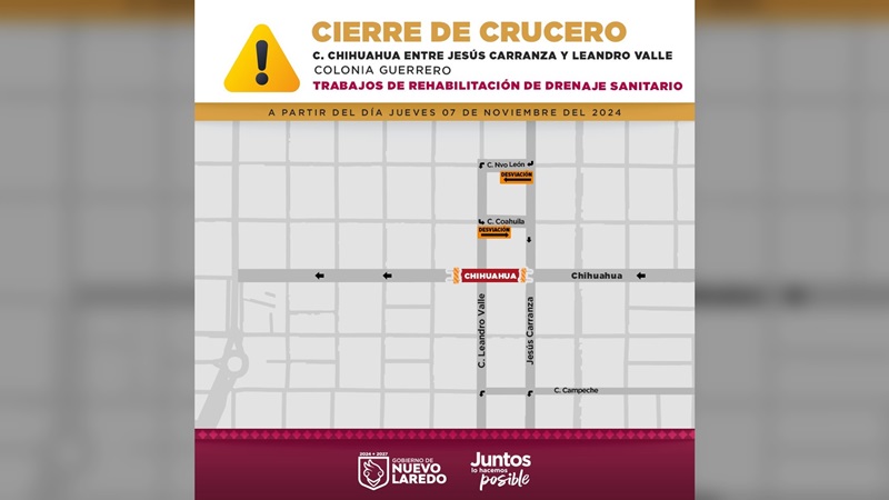 NUEVO LAREDO, TAMPS. Por motivos de la rehabilitación de la red de drenaje sanitario, el Gobierno Municipal informa que la calle Chihuahua, entre Jesús Carranza y Leandro Valle de la colonia Guerrero, permanecerá cerrada por los trabajos correspondientes a la obra.