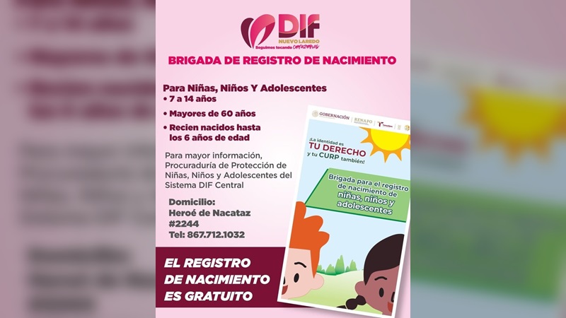 NUEVO LAREDO, TAMPS. El Sistema para el Desarrollo Integral de la Familia (DIF) invita a la comunidad a participar en la Brigada de Registro de Nacimiento organizada por la Coordinación General del Registro Civil de Tamaulipas.