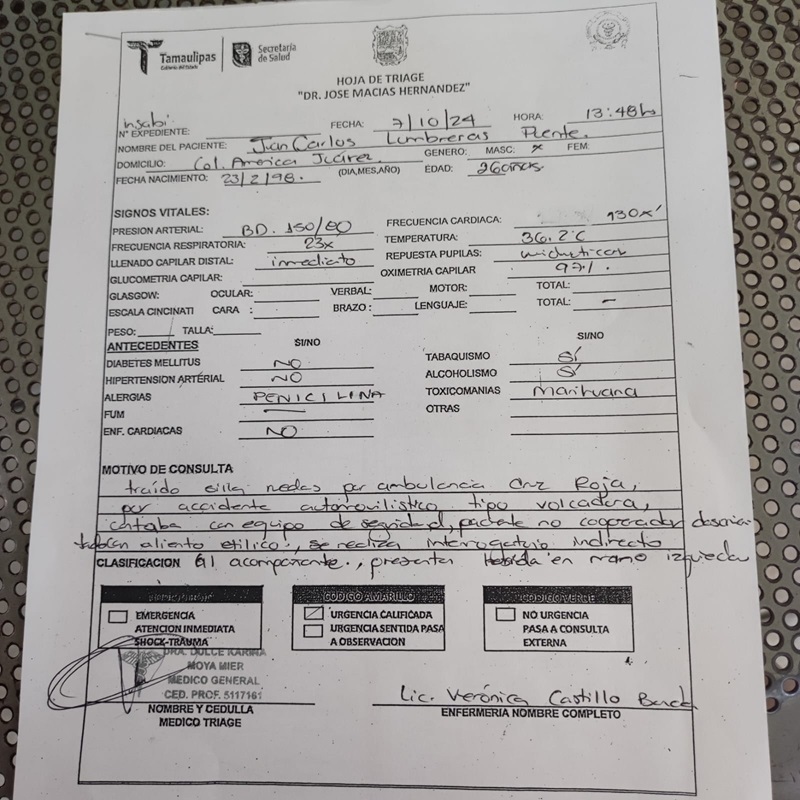 La diferencia de esta nota y la que publica Victoria MX es que aquí si contamos con pruebas, por lo cual adjuntamos el parte medico donde sale positivo a “Alcohol y Opioides (marihuana)”.