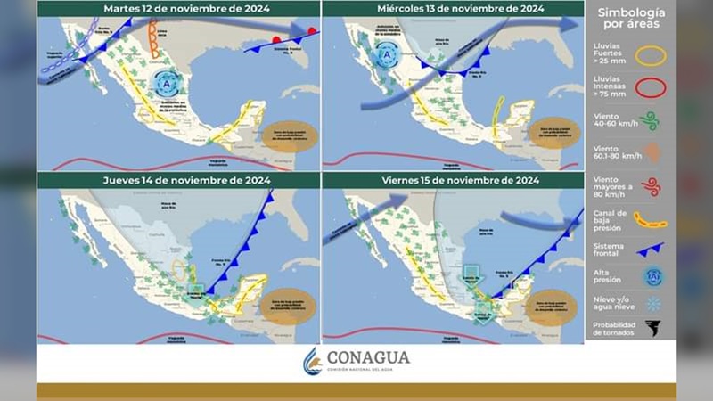 El viernes 15 de noviembre, el frente frío se extenderá sobre el golfo de México, manteniendo el evento de «Norte» con fuertes vientos y generando lluvias en la península de Yucatán y el sureste mexicano.