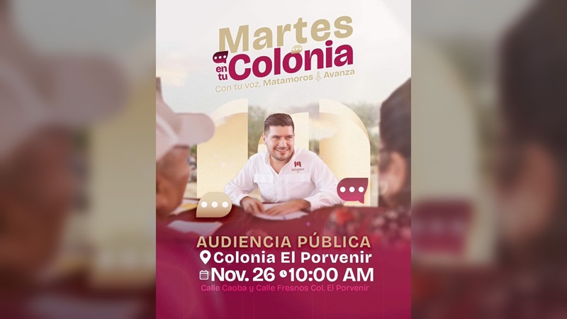 MATAMOROS, TAMPS. En un esfuerzo por fortalecer el vínculo entre la administración municipal y la ciudadanía, el alcalde Alberto Granados invita a los matamorenses a participar en la próxima jornada de “Martes en tu Colonia”, que se llevará a cabo este martes 26 de noviembre en la colonia El Porvenir, a partir de las 10:00 de la mañana.