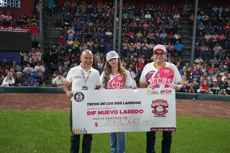 Durante el evento, la presidenta del Sistema DIF Nuevo Laredo, Claudette Canturosas Villarreal, recibió de manos de Chara Mansur presidente del Club de Béisbol Tecos de los Dos Laredos un cheque simbólico por un monto de 273 mil 560 pesos, destinado a fortalecer los programas de inclusión y apoyo a personas con discapacidad que impulsa el DIF.