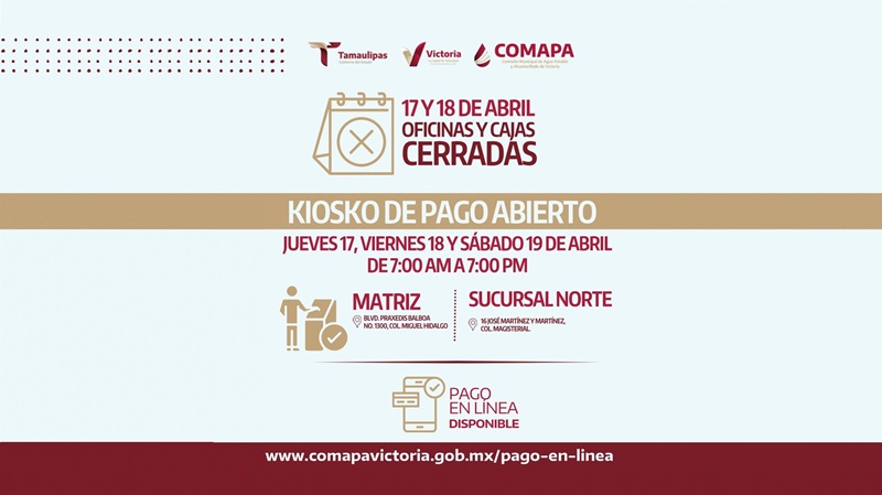 CIUDAD VICTORIA, TAMPS. La Comisión Municipal de Agua Potable y Alcantarillado de Victoria (COMAPA Victoria) informa a la ciudadanía que, con motivo del periodo de Semana Santa, sus oficinas para cobro, trámites y atención a usuarios permanecerán cerradas los días jueves 17 y viernes 18 de abril de 2025.