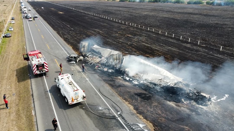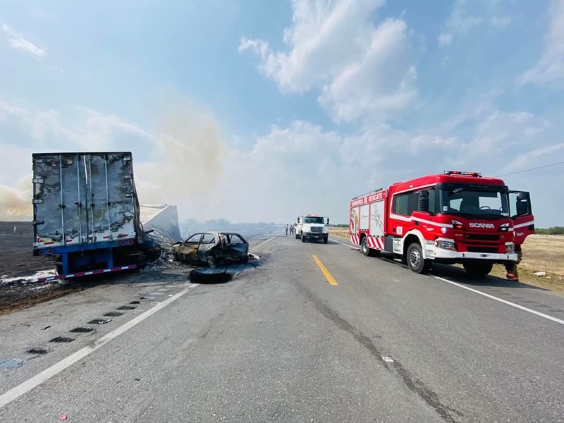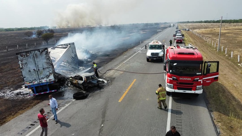 CIUDAD VICTORIA, TAMPS. Lo que empezó como un incendio de pastizal terminó como un múltiple carreterazo en el cual tres vehículos fueron consumidos por el fuego entre ellos un tráiler, así como 10 personas resultaron lesionadas.