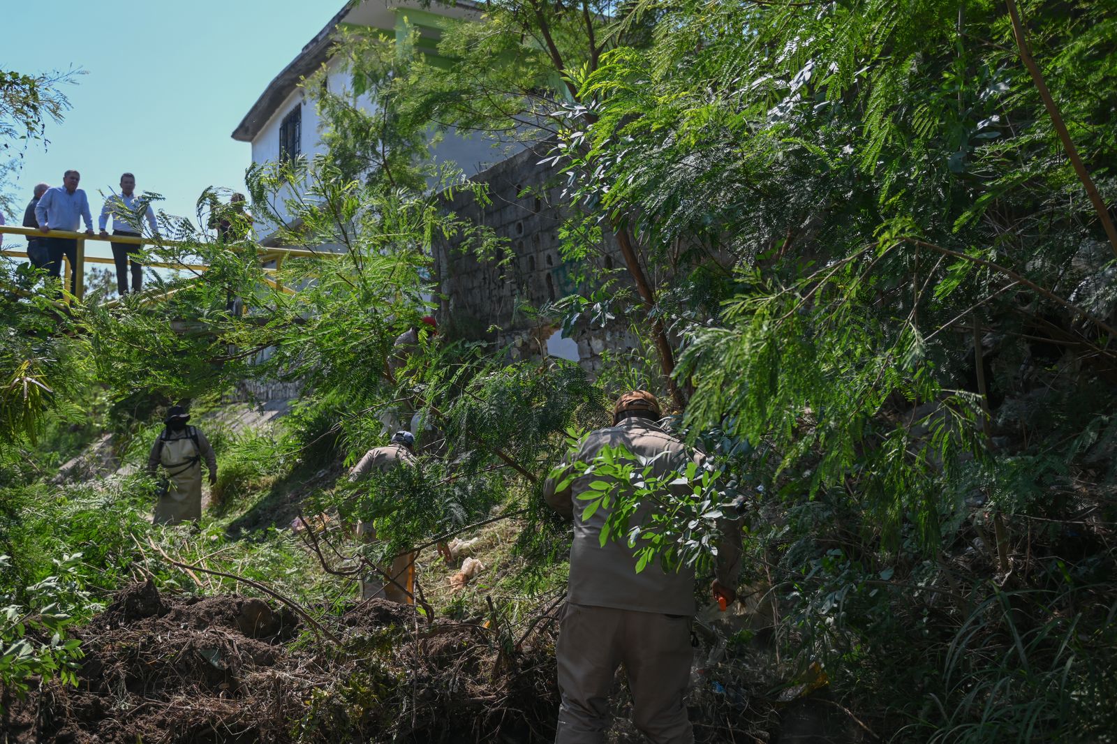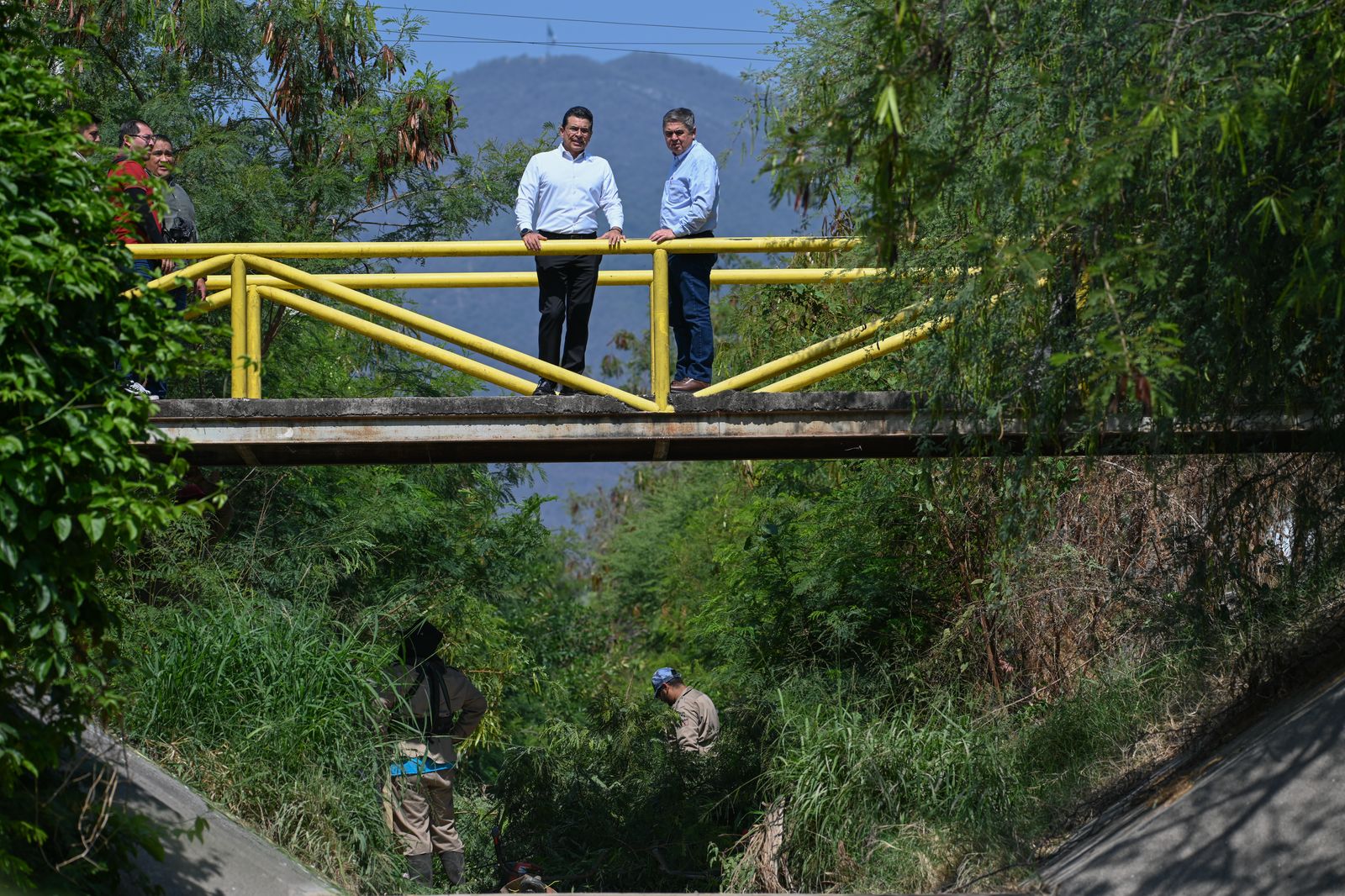 El presidente municipal de Victoria Eduardo Gattás Báez y el Gerente General de COMAPA Fernando García Fuentes, supervisaron este lunes los trabajos en el dren del Fraccionamiento FOVISSSTE, hasta donde se han desazolvando 3 mil metros lineales de canales de desagüe para reducir riesgos de inundaciones.
